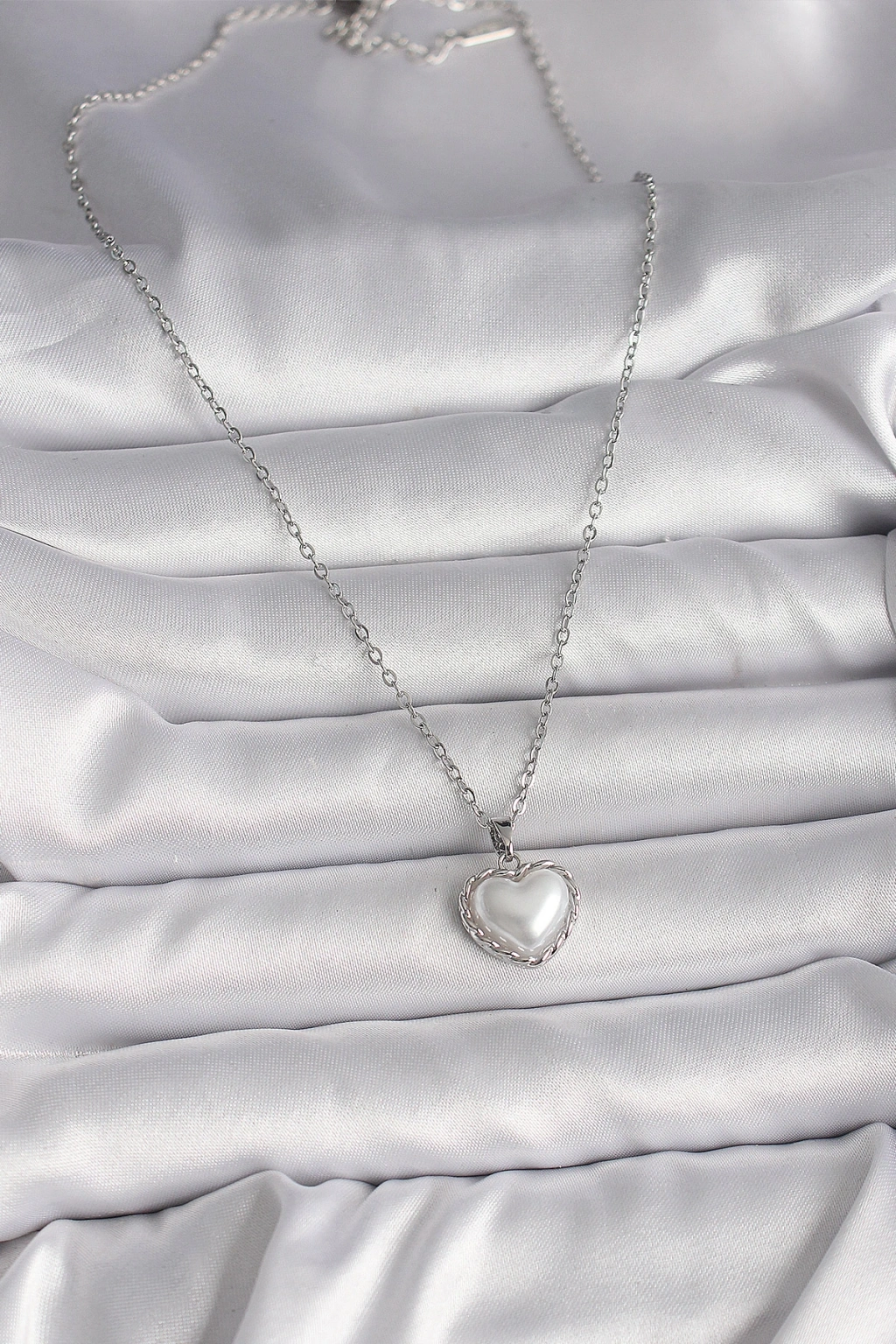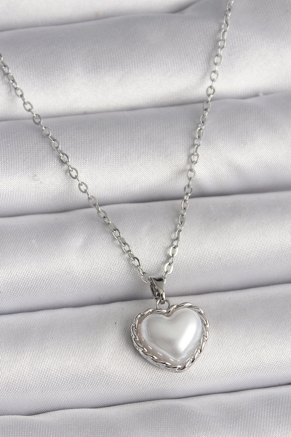 316L Çelik Gümüş Renk Zincir 3D İnci Kalp Model Kadın Kolye