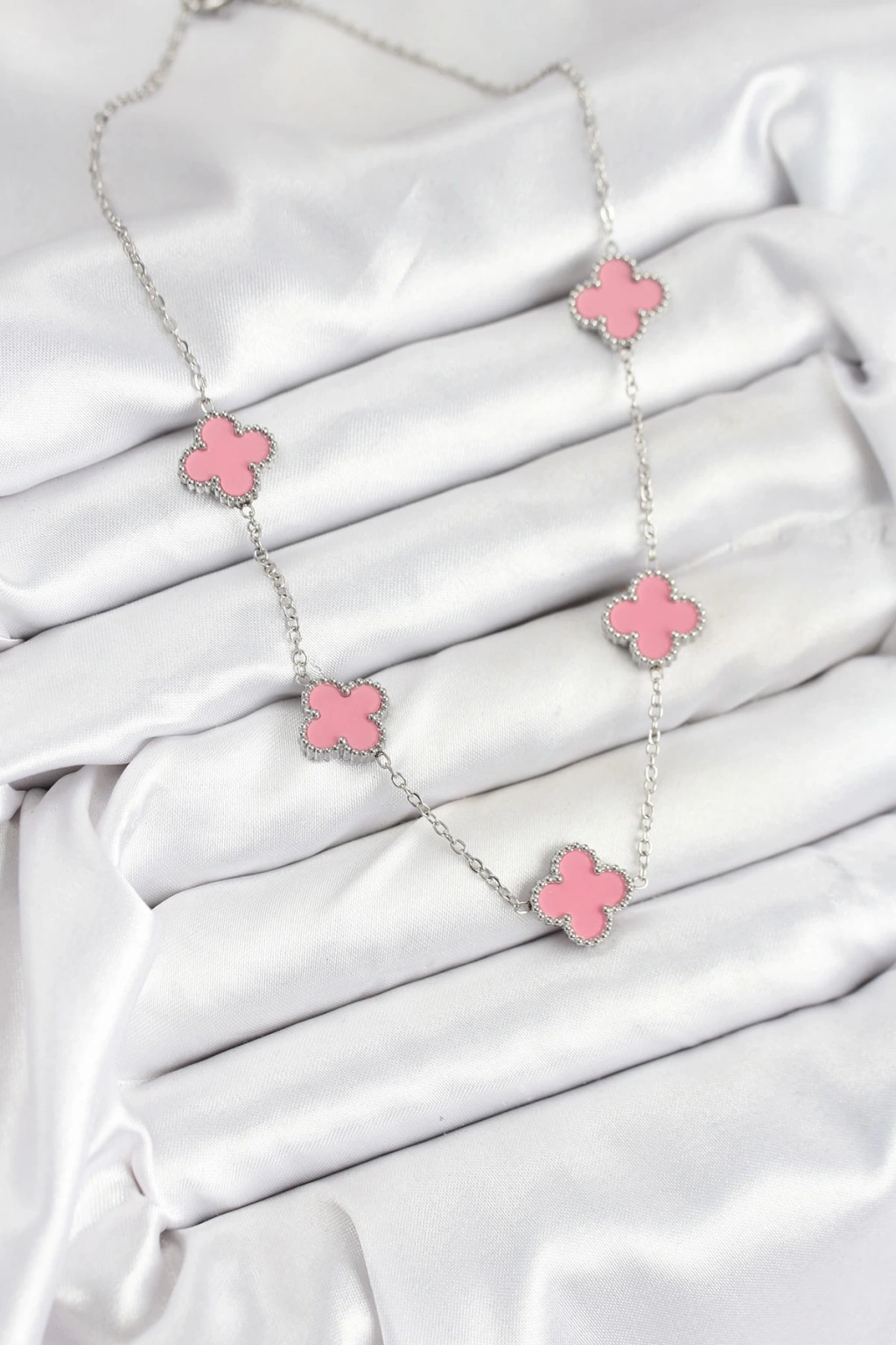 316L Çelik Zincir Gümüş Pembe Renk Yonca Kadın Kolye