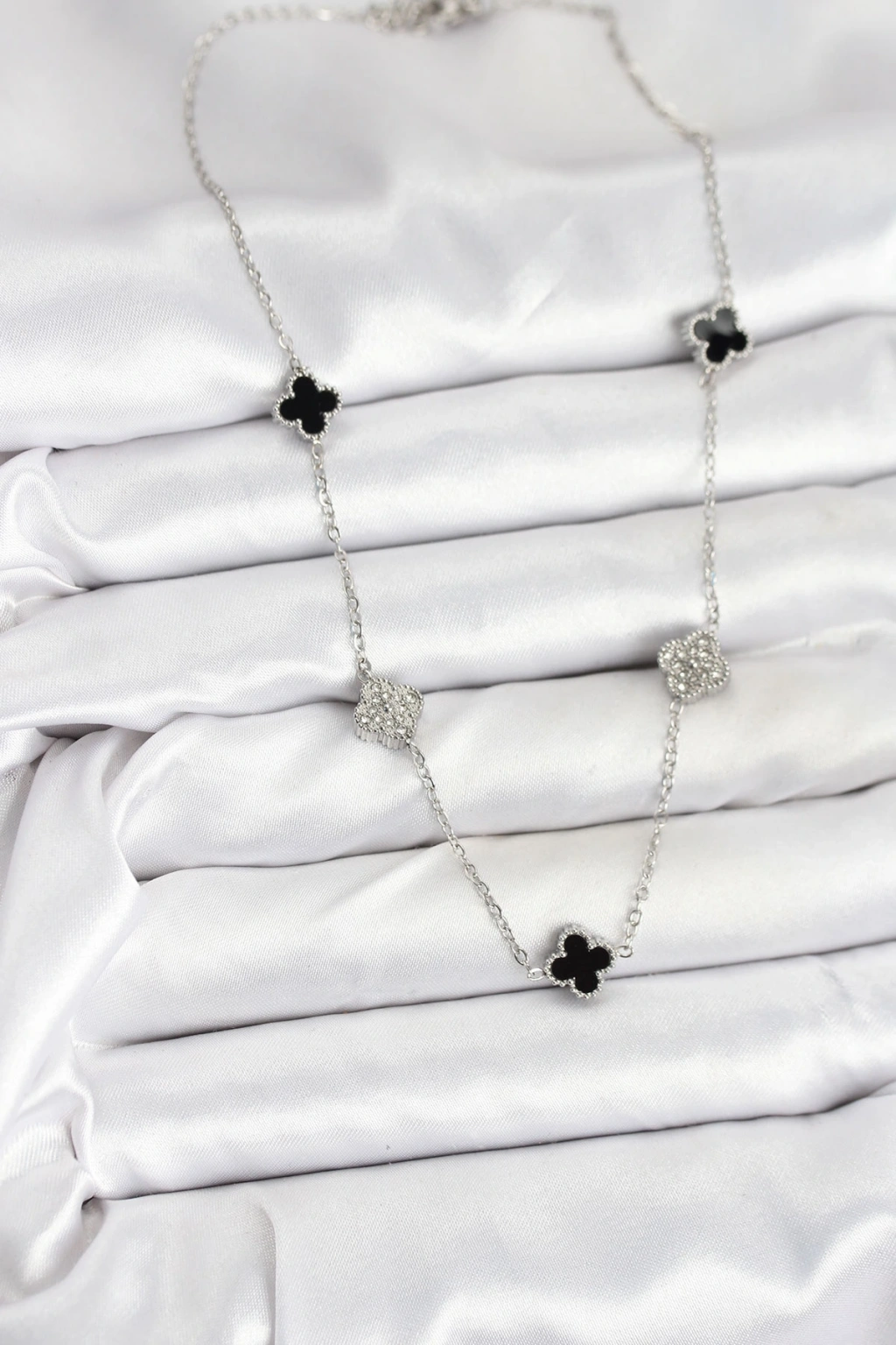316L Çelik Zincir Gümüş Renk Siyah ve Zirkon Taşlı Baby Boy Yonca Kadın Kolye