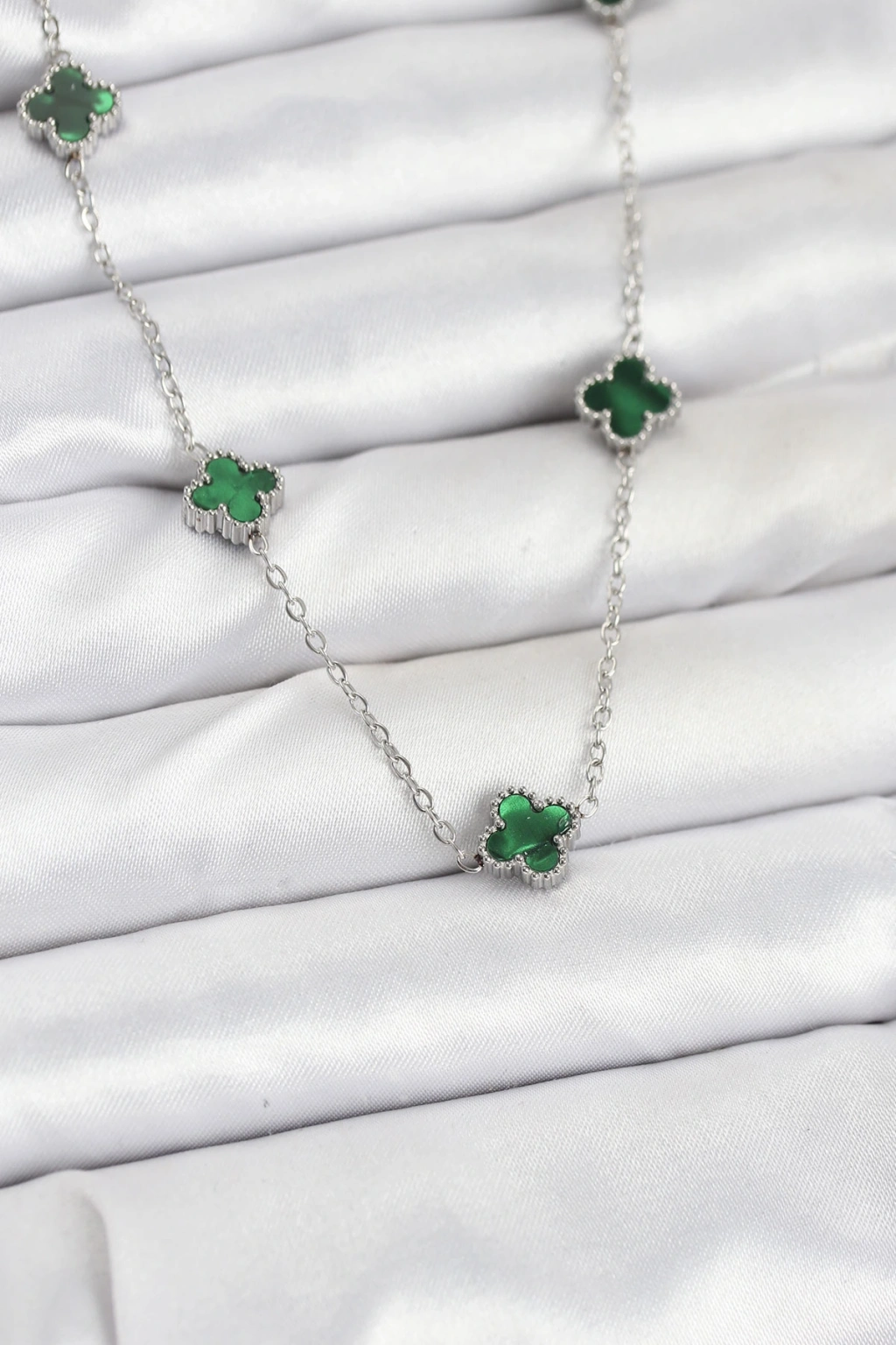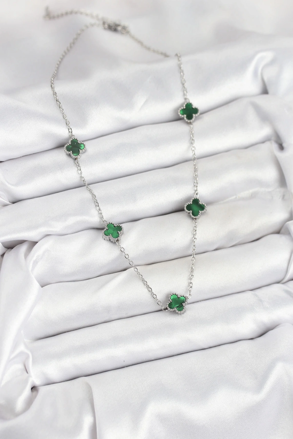 316L Çelik Zincir Gümüş Renk Yeşil Baby Boy Yonca Kadın Kolye