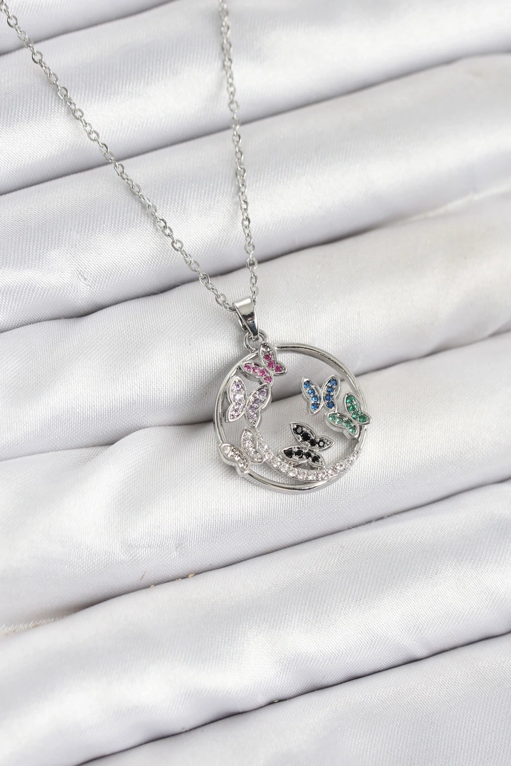316L Çelik Zincir Gümüş Renk Zirkon Taşlı Kelebekli Kadın Kolye