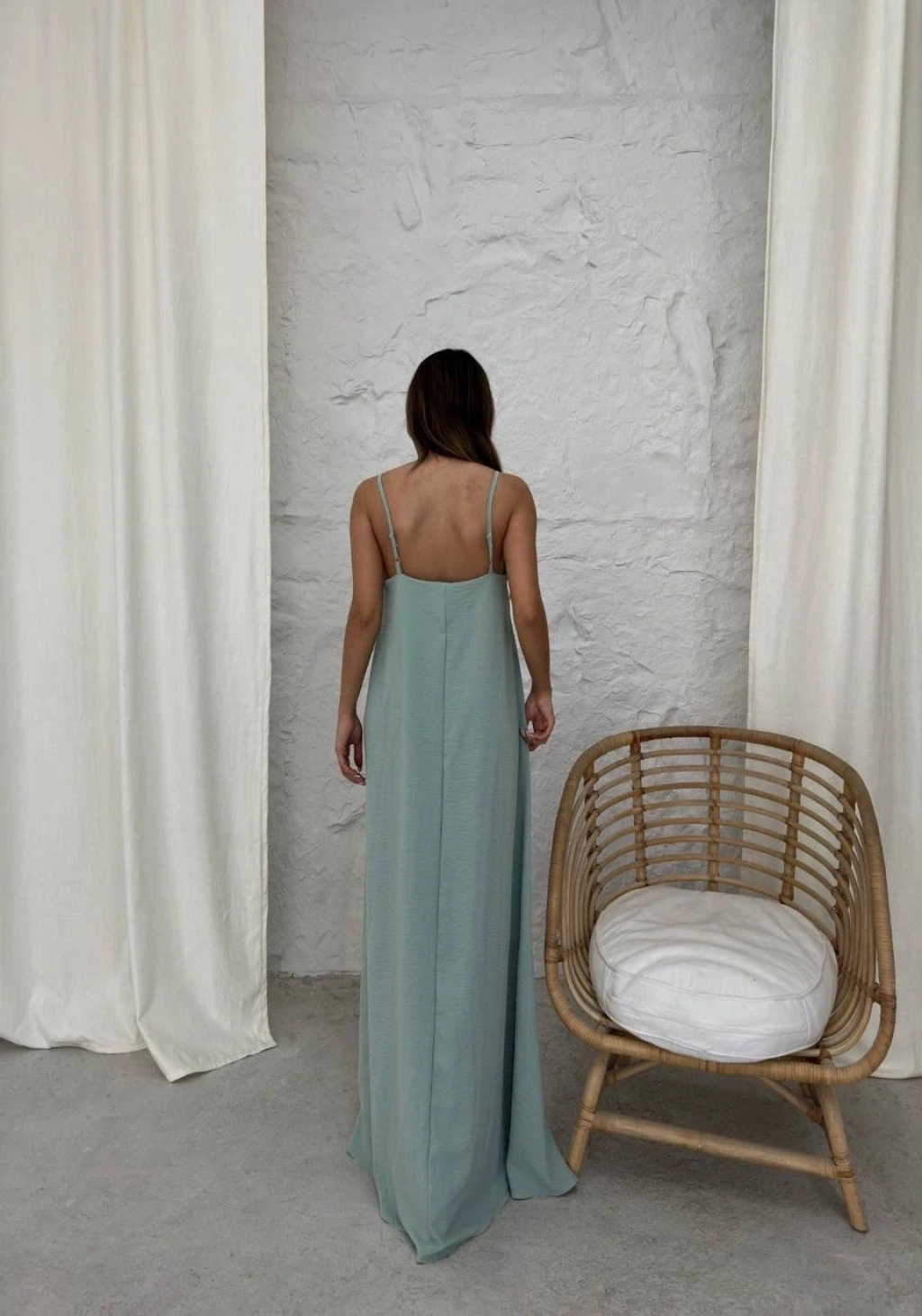 Yırtmaçlı kalın bürümcük uzun elbise Yeşil