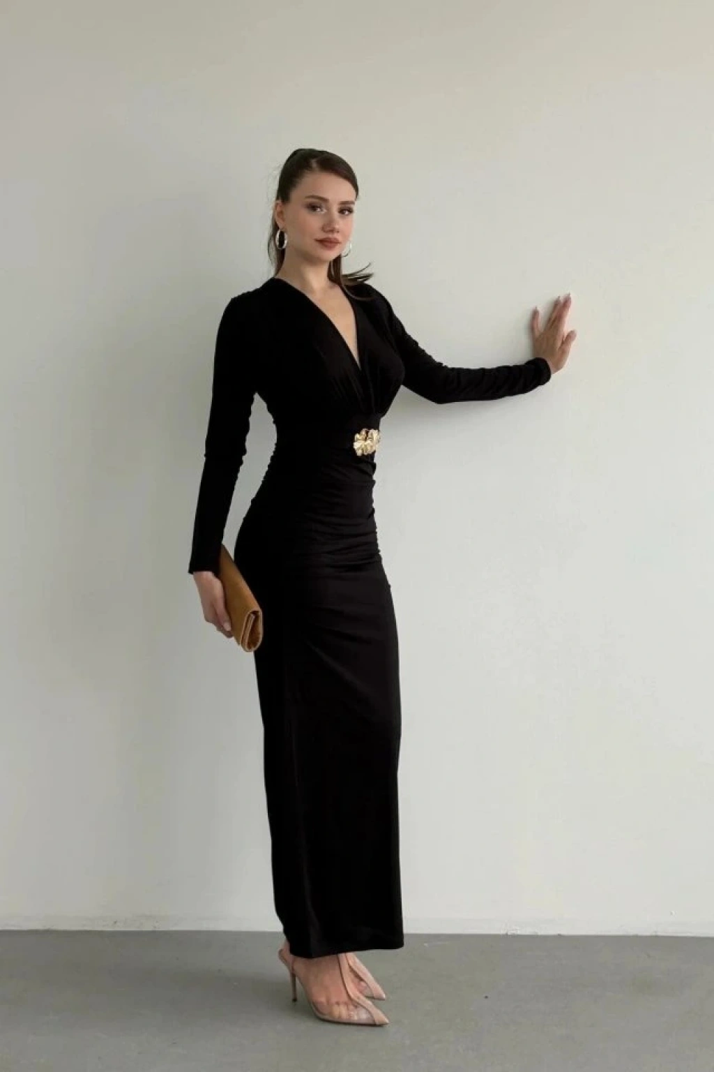 Aksesuarlı Kemerli Drapeli Uzun Elbise