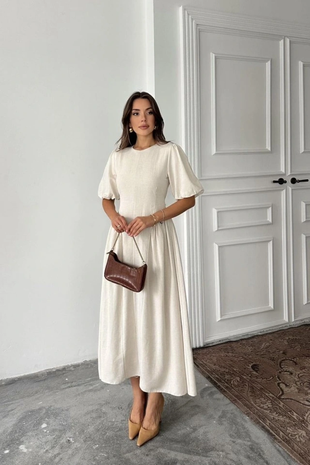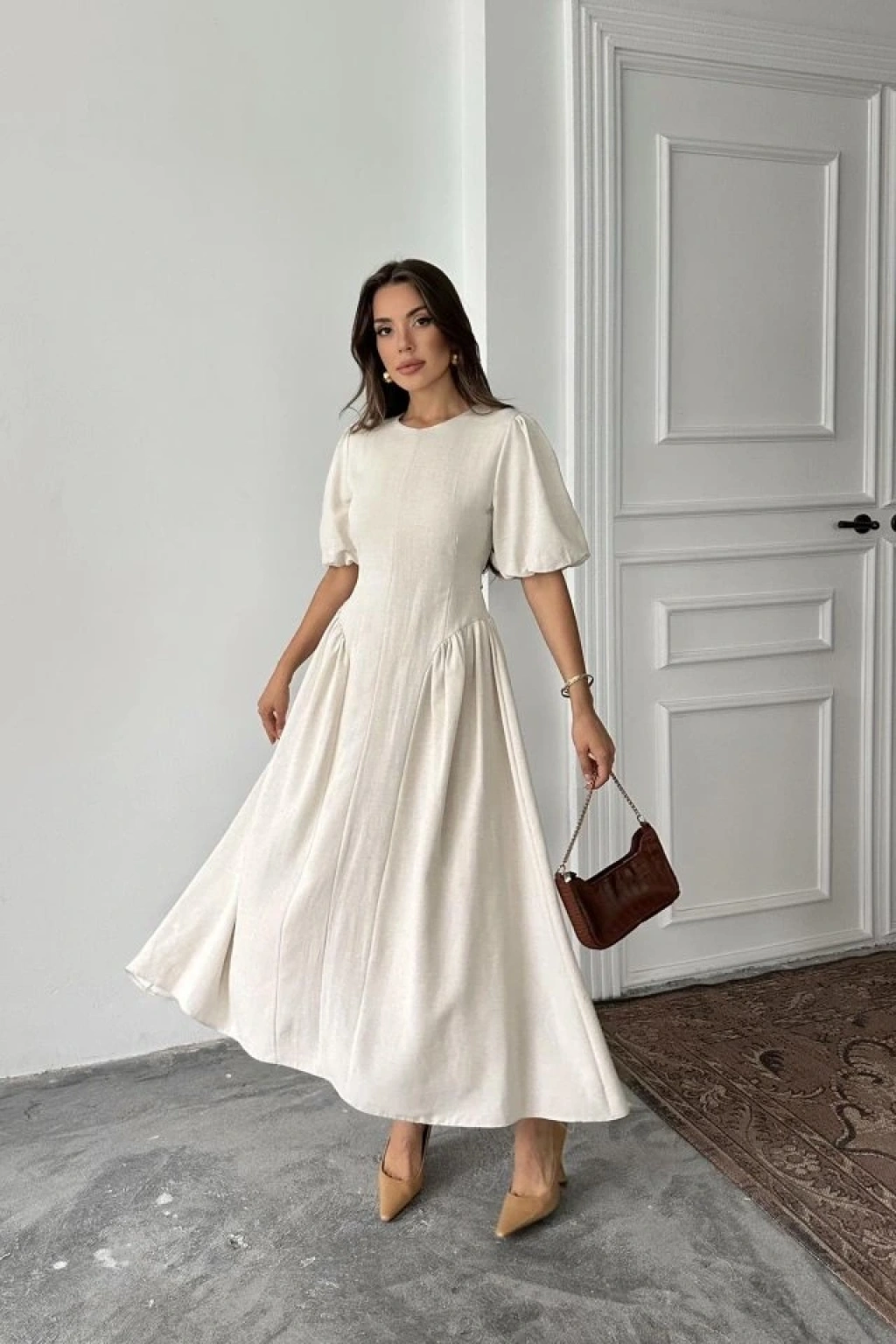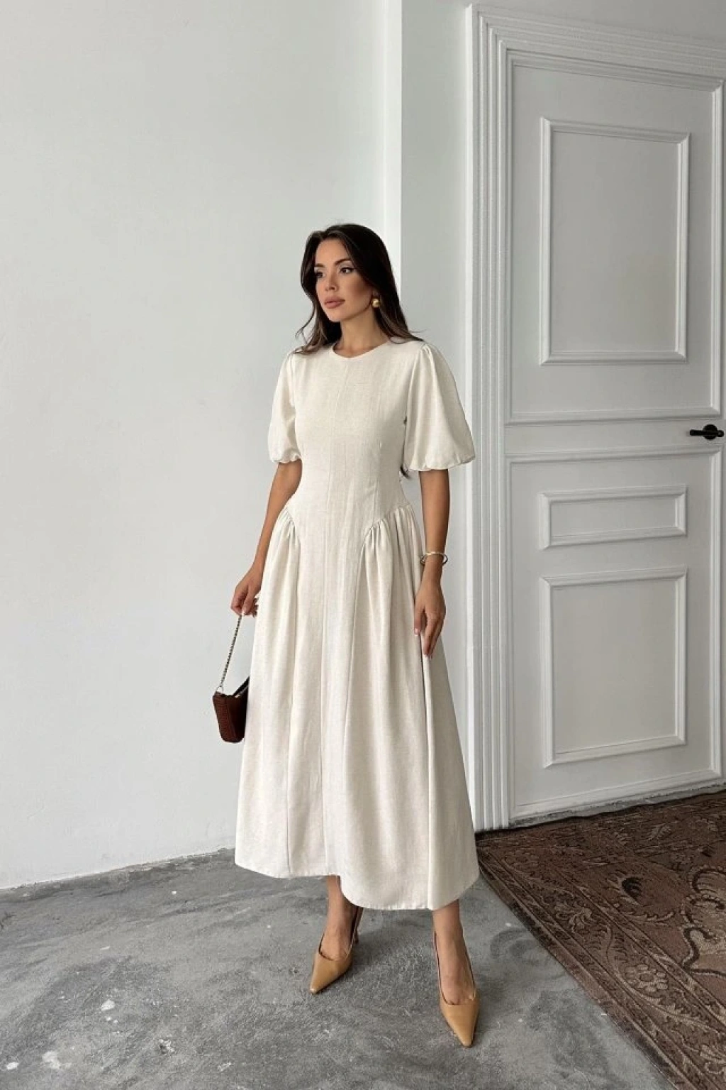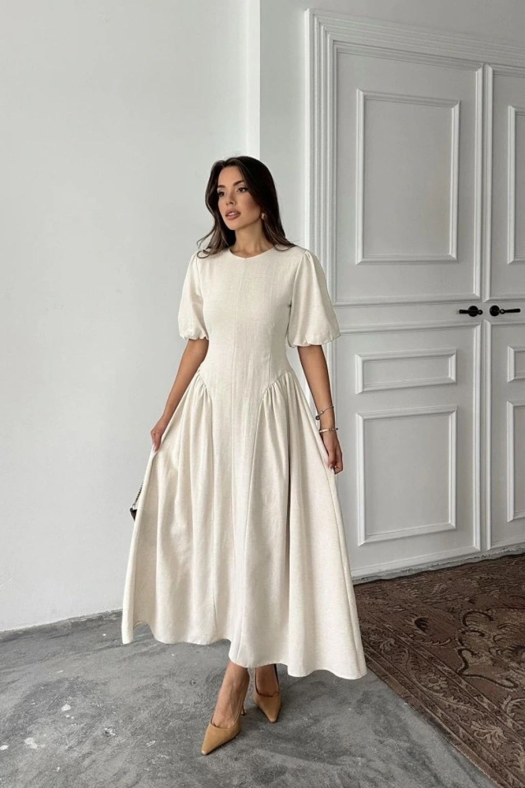 Bej Arkadan Bağlamalı Büzgülü Keten Elbise