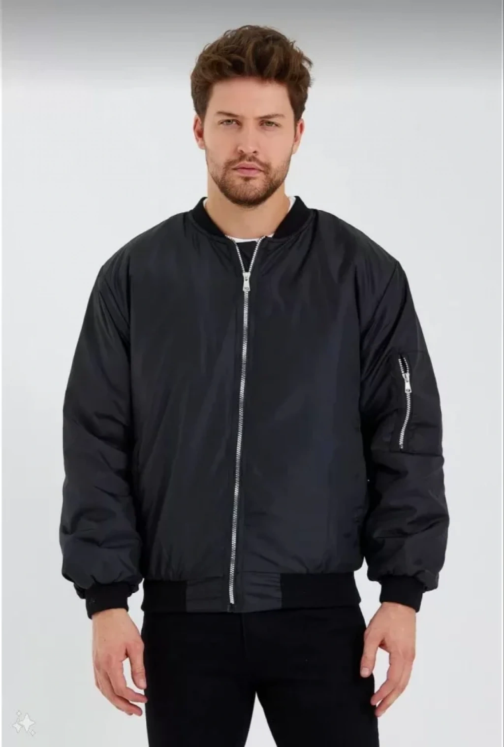 Uzun Kol Astarlı Tam Kalıp Baskılı Bomber Ceket - Siyah