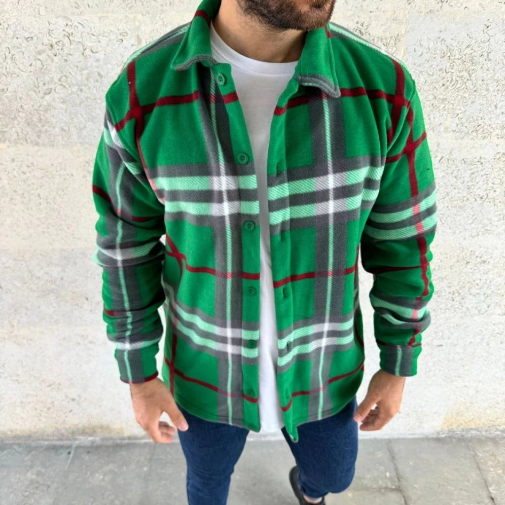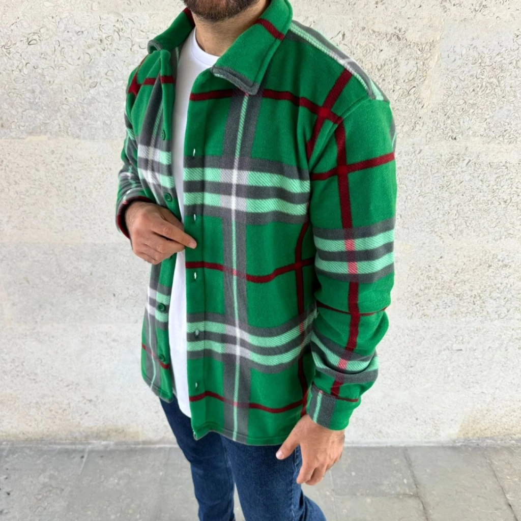 Erkek Pelüş Polar Hırka Gömlek – Yakalı, İlik Düğmeli, Göğüs Cepli, Yumuşak Dokulu Kışlık Regular Fit Rahat Günlük Model - Çimen Yeşili