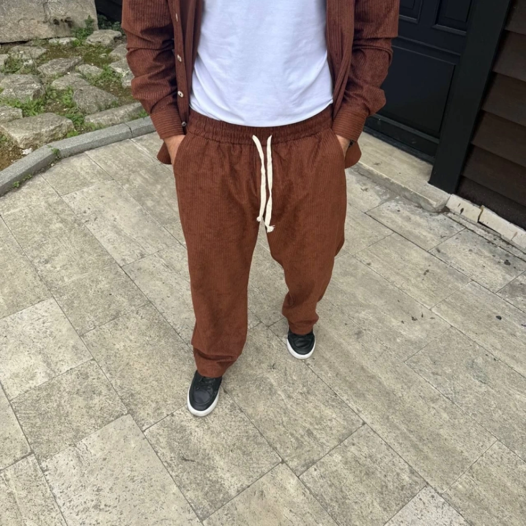 Erkek Fitilli Kadife Cepli Buggy Pantolon Oversize Rahat Kalıp - Kahverengi