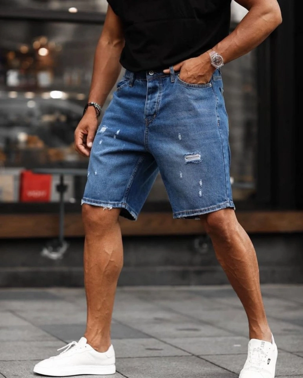Erkek Kar Yıkama Yırtık Detaylı Şort