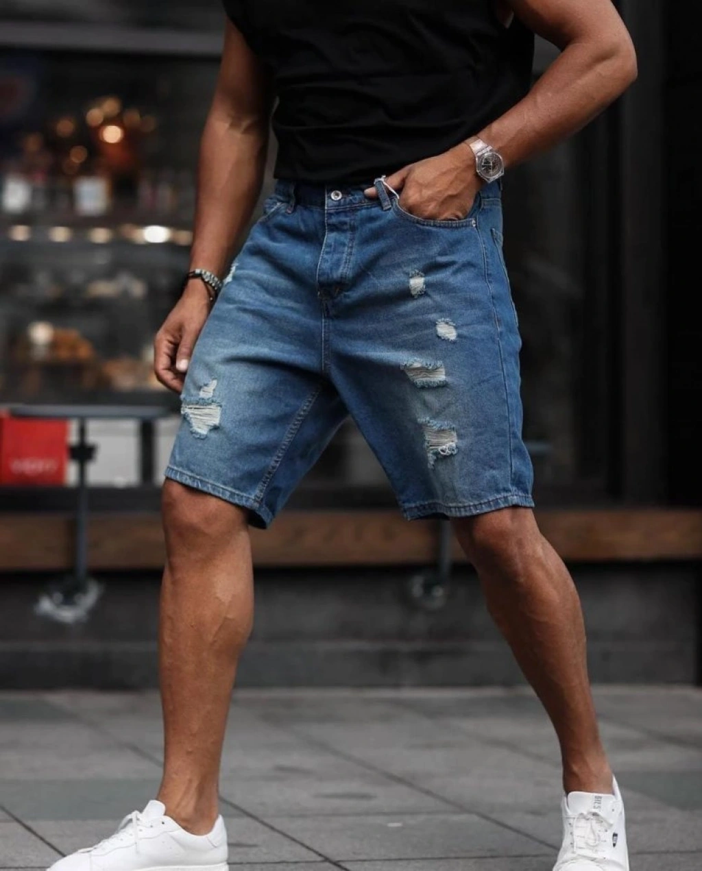 Erkek Kar Yıkama Yırtık Detaylı Şort