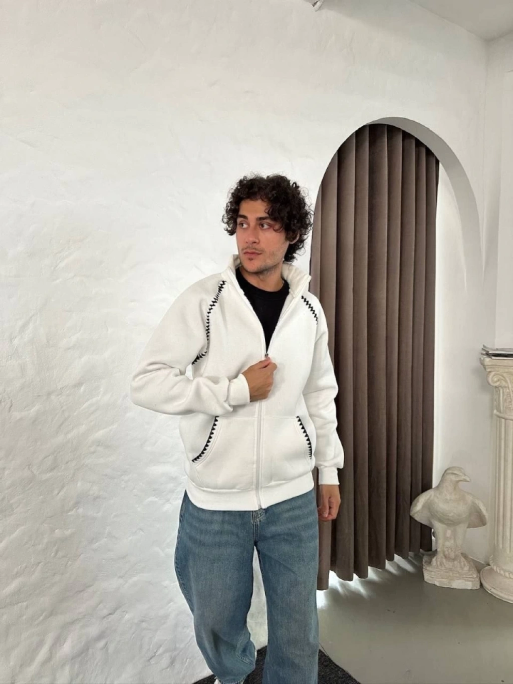 Erkek Oversize Dik Yaka Fermuarlı Sweatshirt - Zincir Nakışli Kanguru Cepli - Beyaz