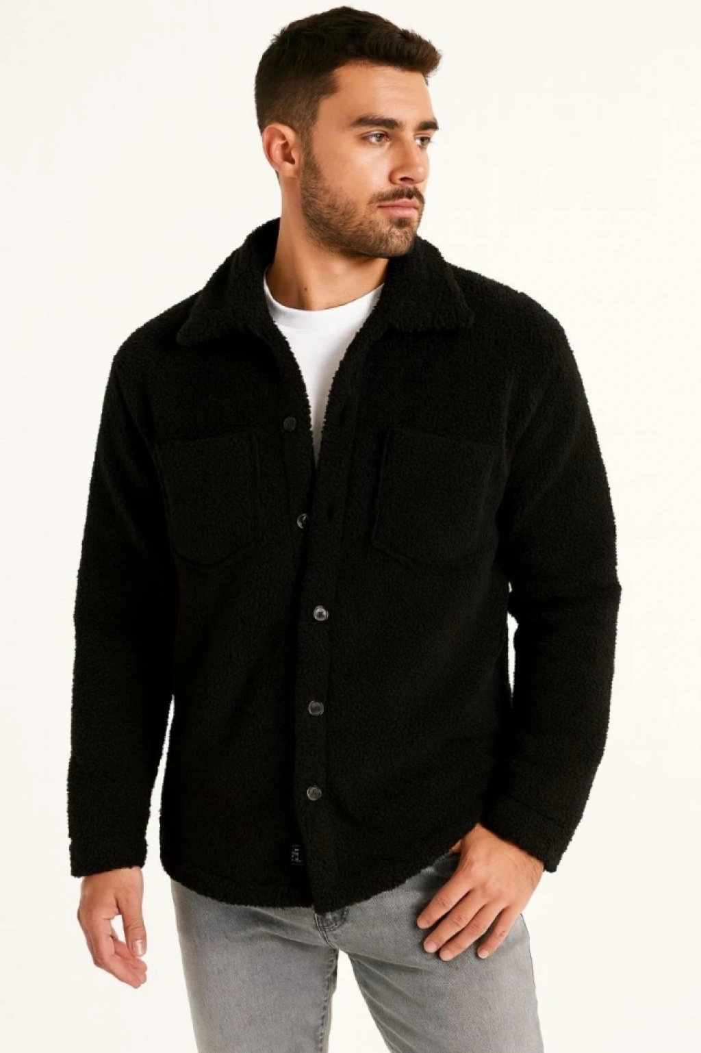 Erkek Pelüş Polar Hırka Gömlek – Yakalı, İlik Düğmeli, Göğüs Cepli, Yumuşak Dokulu Kışlık Regular Fit Rahat Günlük Model - Siyah