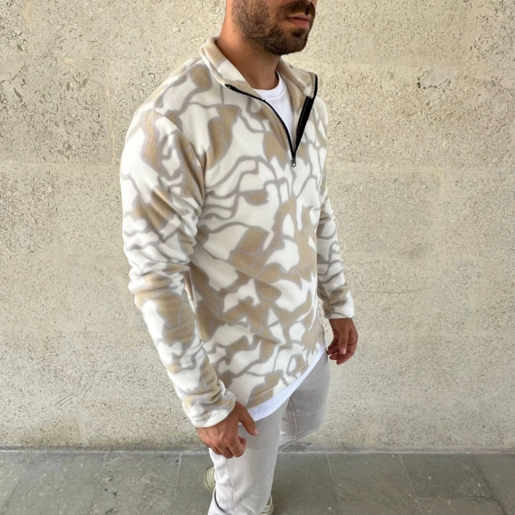Erkek Yarım Fermuarlı Desenli Polar Sweat – Haki Kamuflaj Yakalı, Uzun Kollu, Oversize Rahat Kalıp - Haki