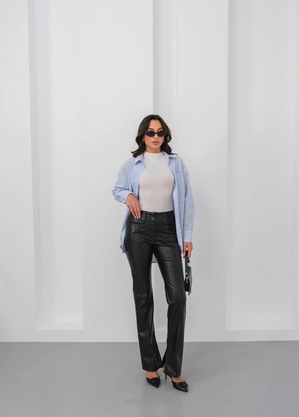 İspanyol yırtmaçlı paça deri pantolon siyah hn