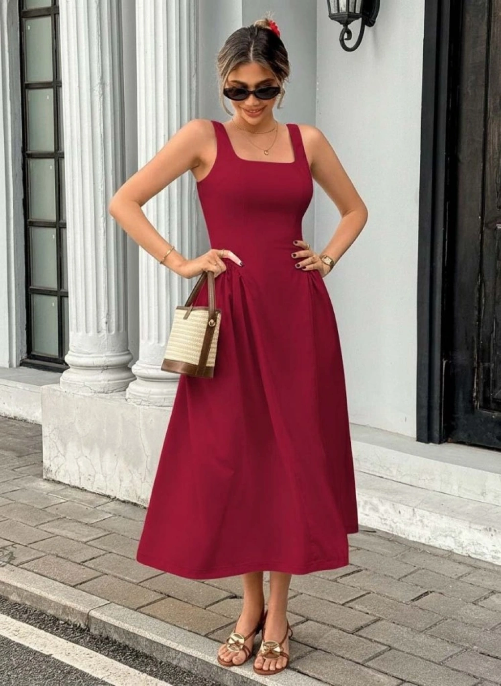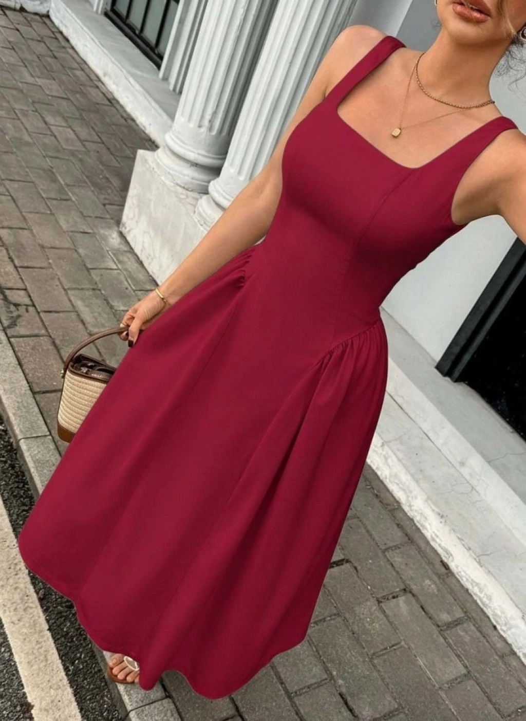 Kadın Askılı Kare Yakalı Uzun Ithal Krep Elbise