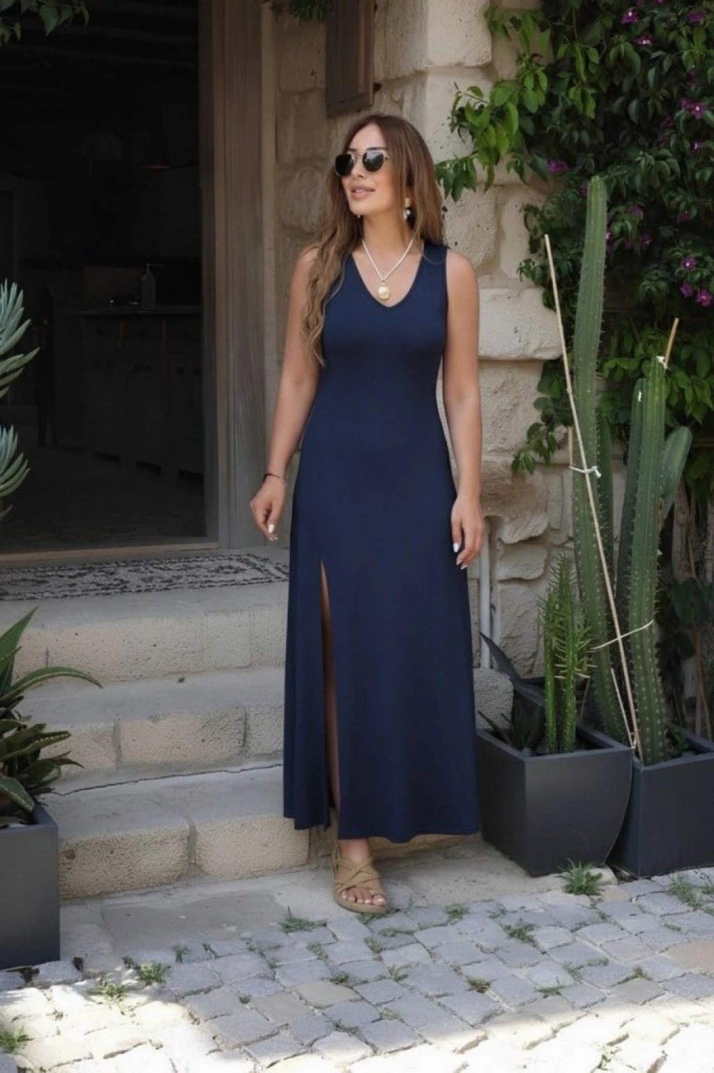 Kadın Askılı V Yakalı Yırtmaçlı Uzun Viskon Elbise