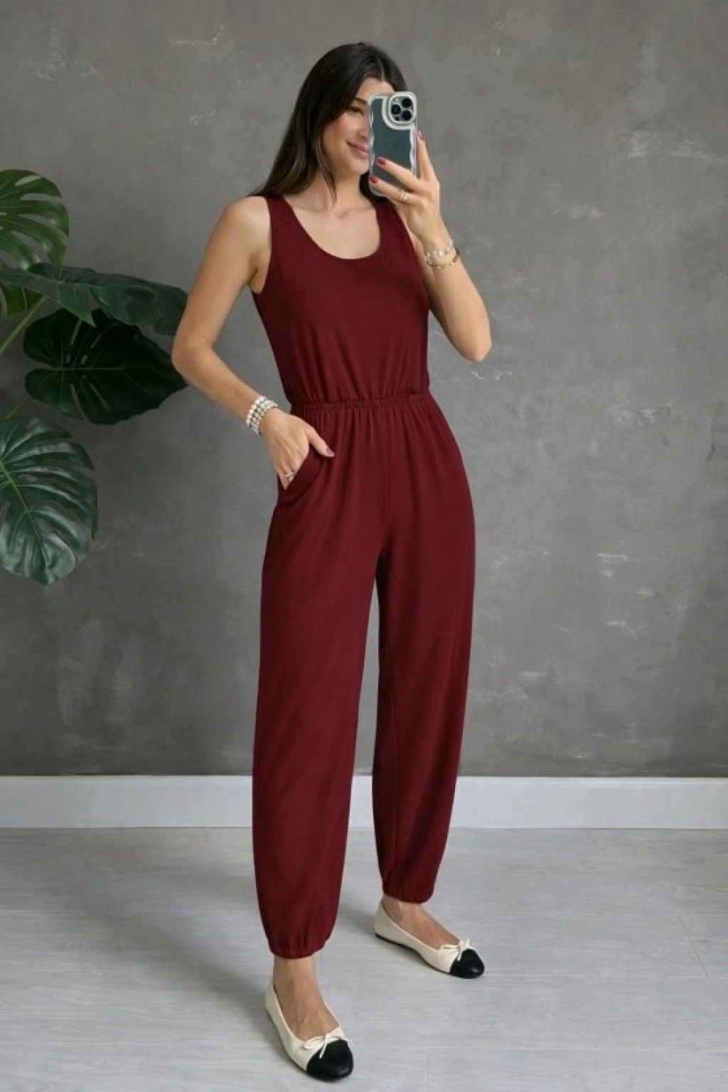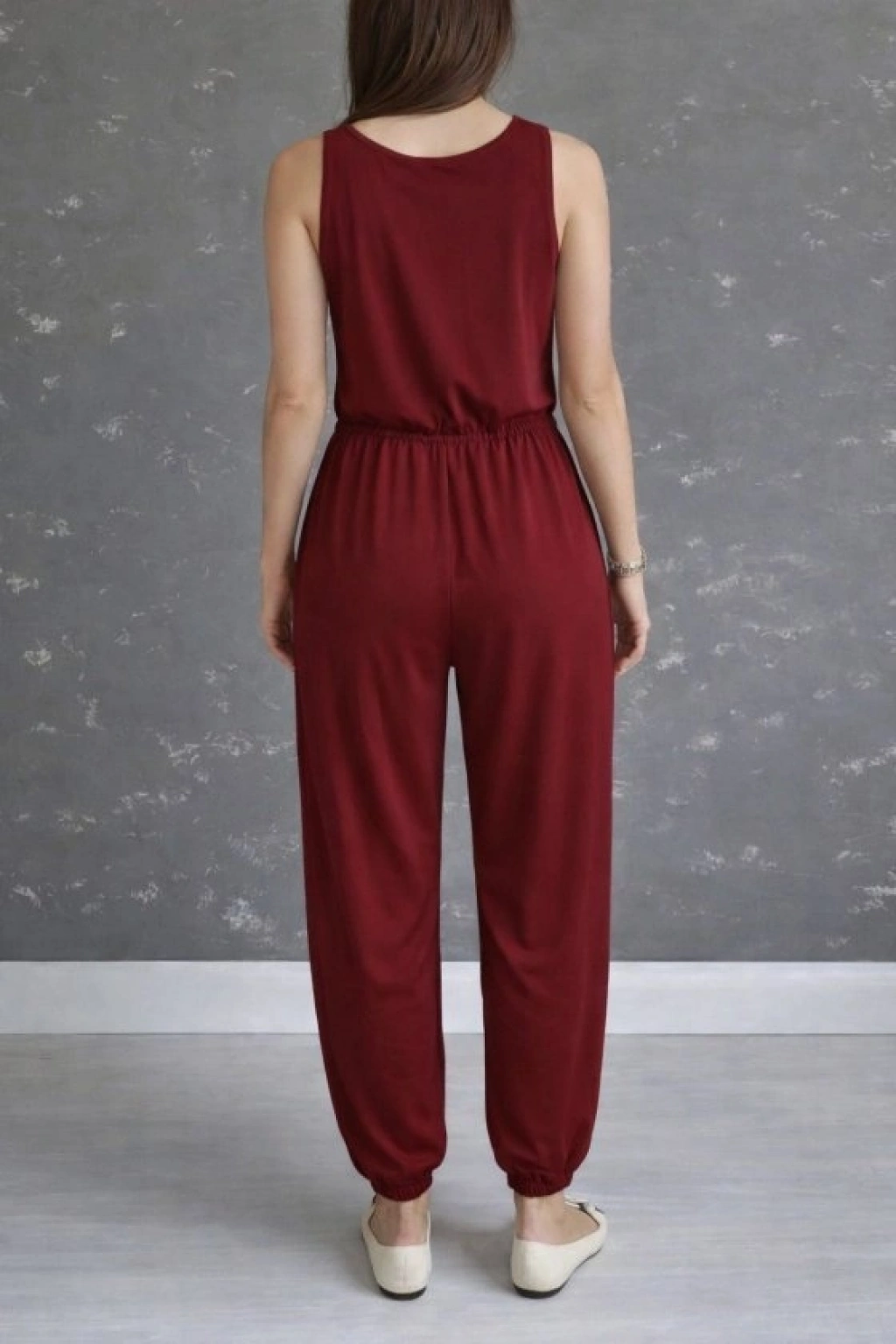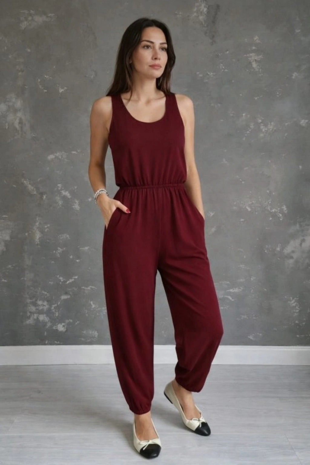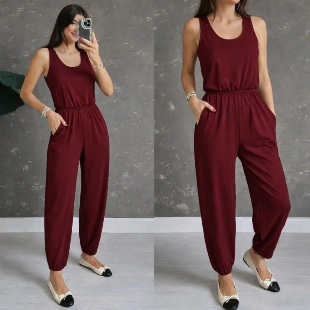 Kadın Askılı Yuvarlak Yakalı Cepli Viskon Tulum