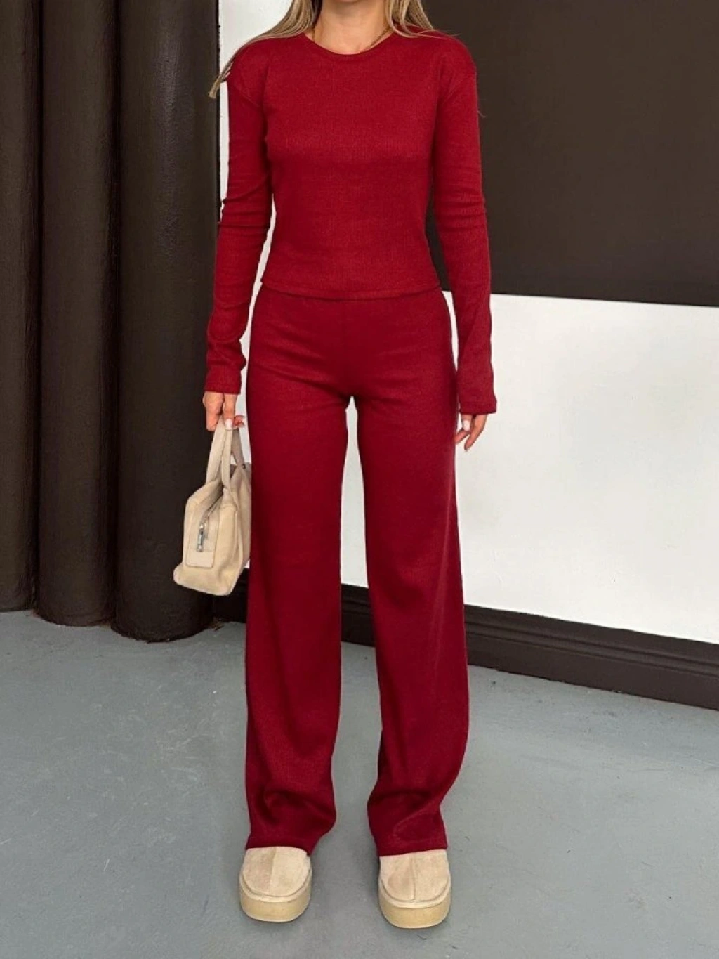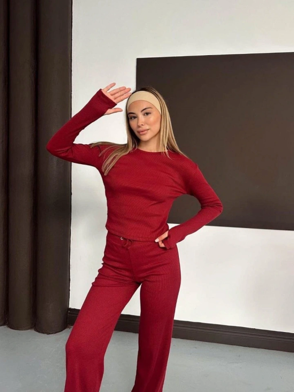 Kadın Bisiklet Yaka Parmak Geçme Detay Uzun Kollu Bluz Ve Pantolon Ikili Takım