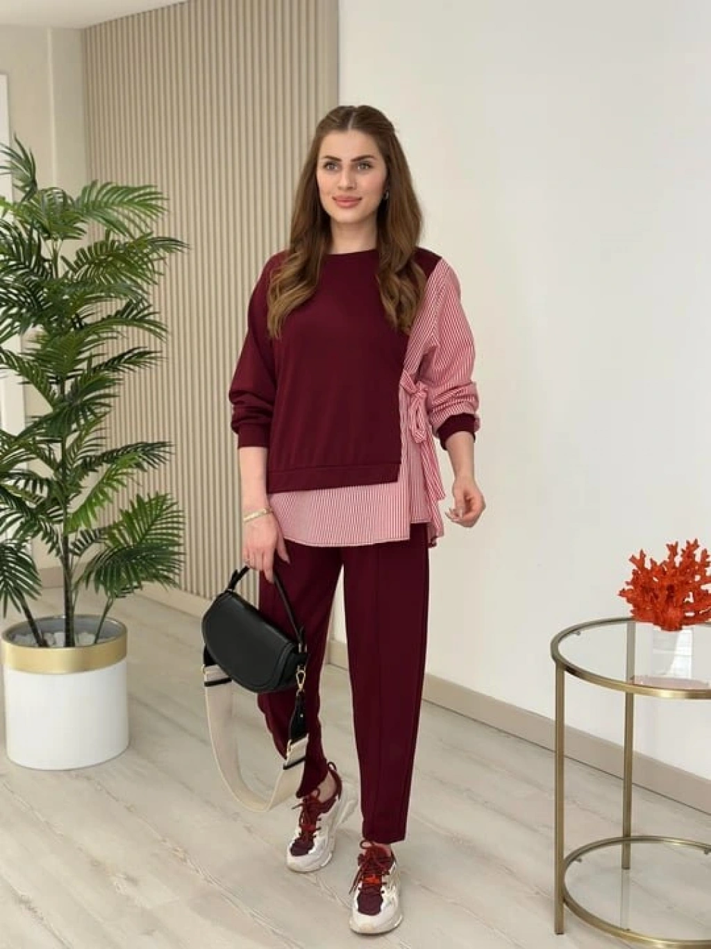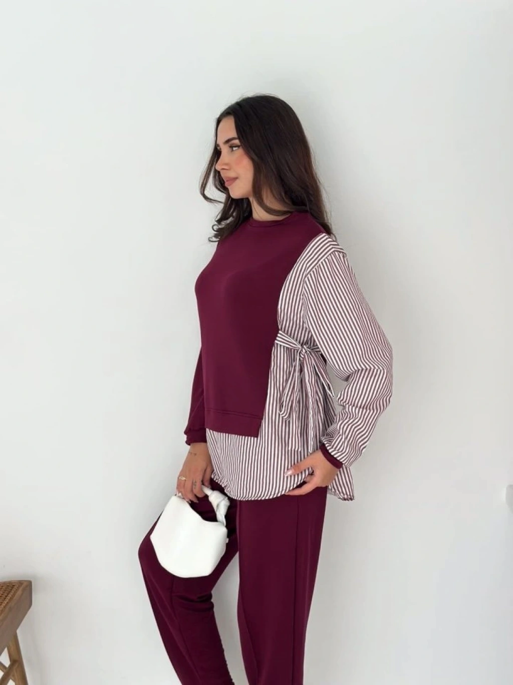 Kadın Gömlek Detay çizgili Yandan Bağlamalı Ikili Takım