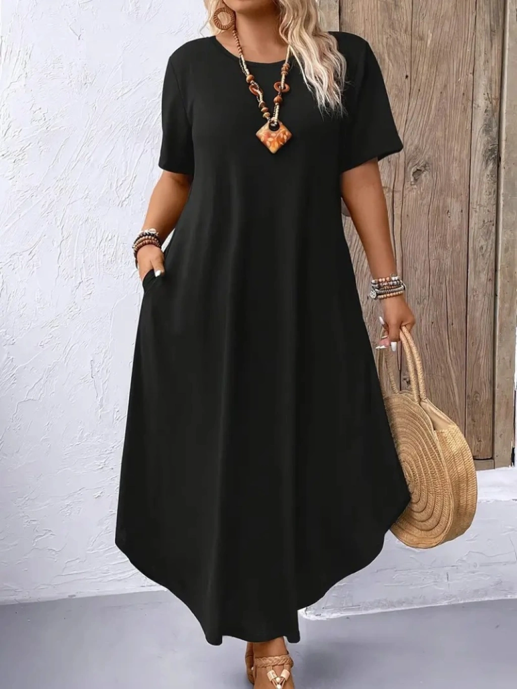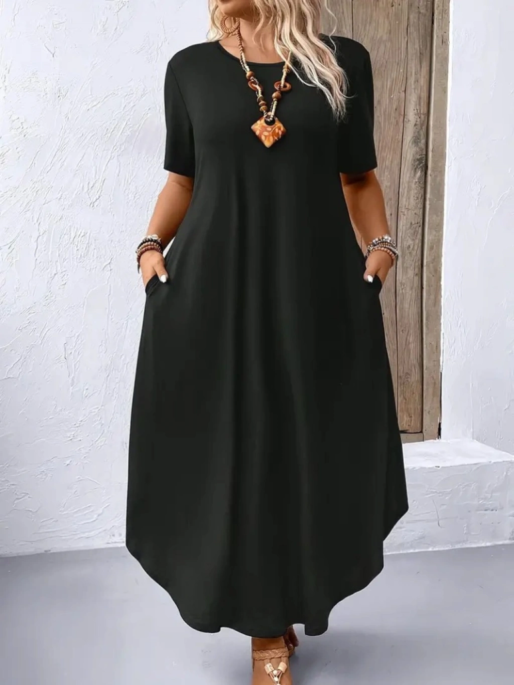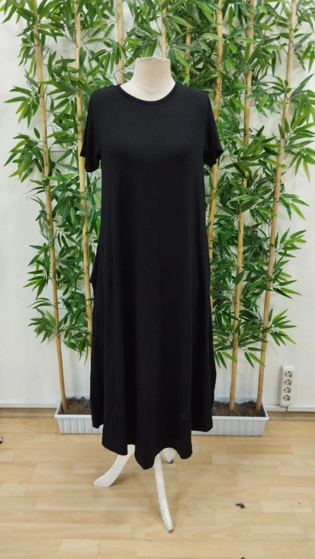 Kadın Kısa Kollu Bisiklet Yaka Cepli Salaş Viskon Elbise