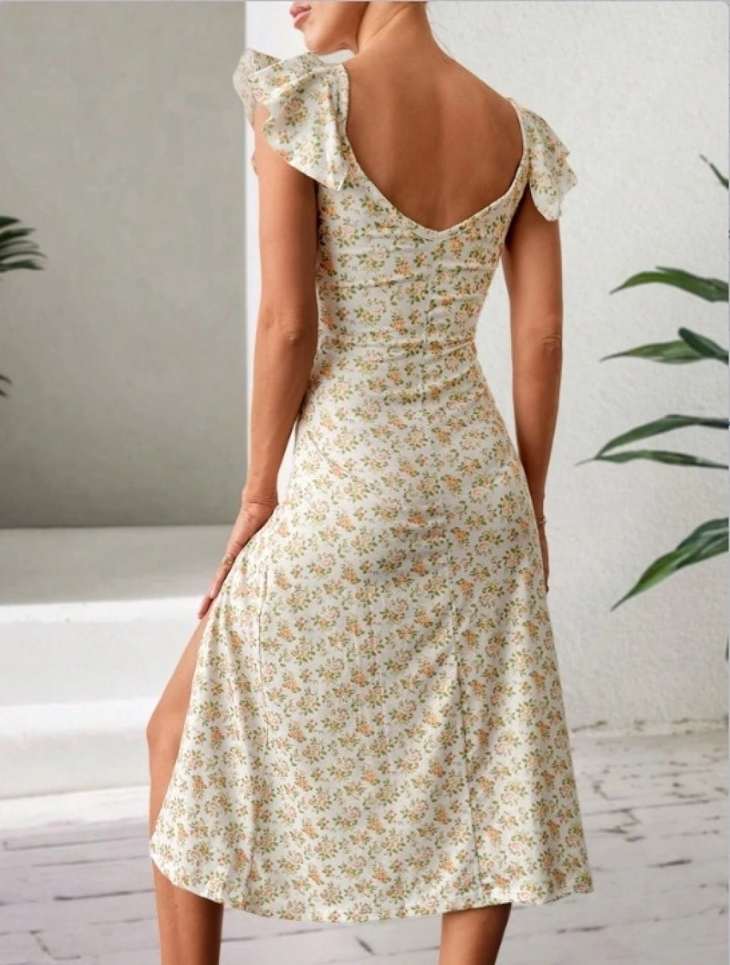 Kadın Kısa Kollu çiçek Desen Yırtmaçlı Süprem Elbise