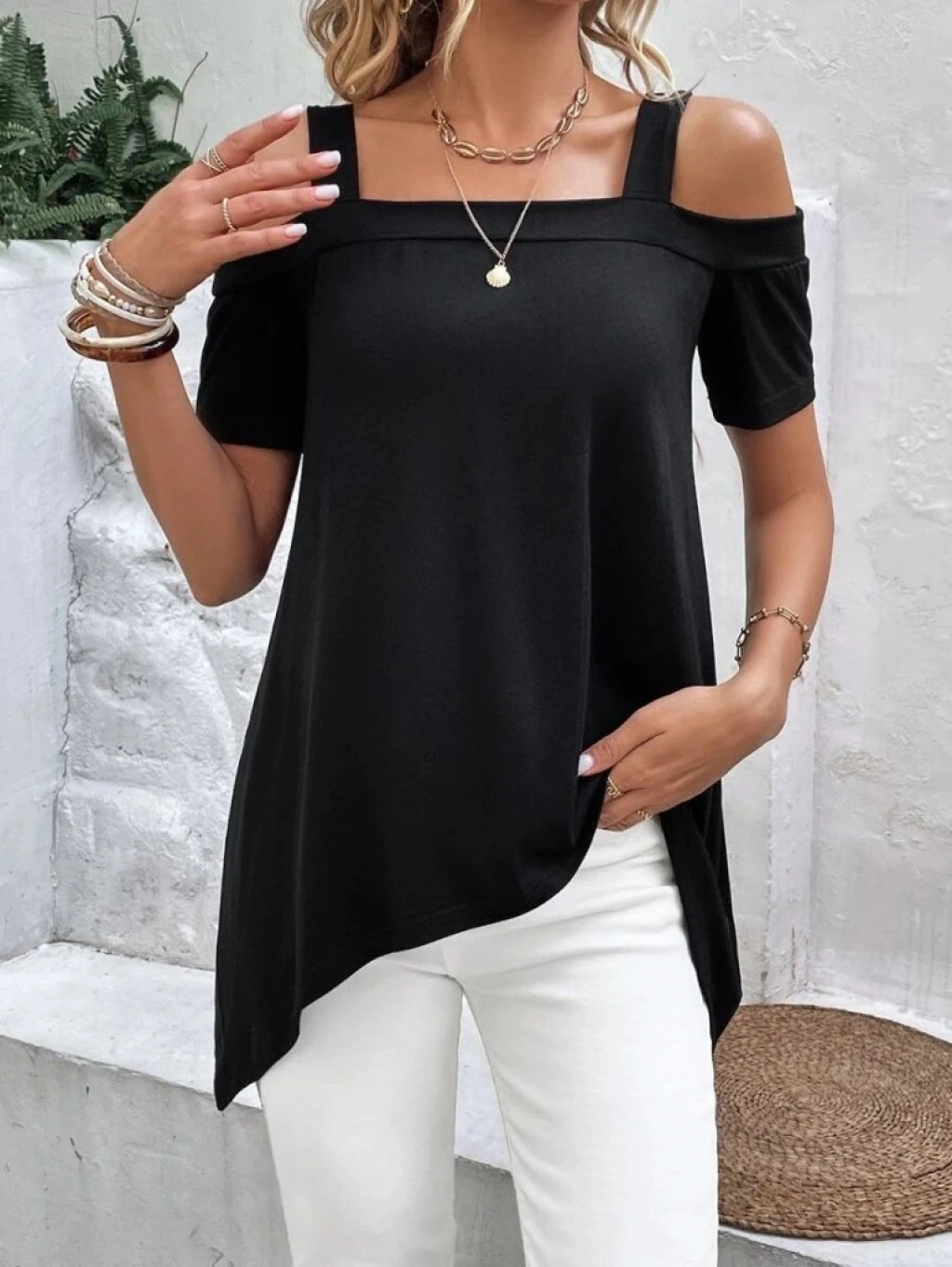 Kadın Kısa Kollu Omuzlardan Açık Askılı Asimetrik Kesim Viskon Bluz