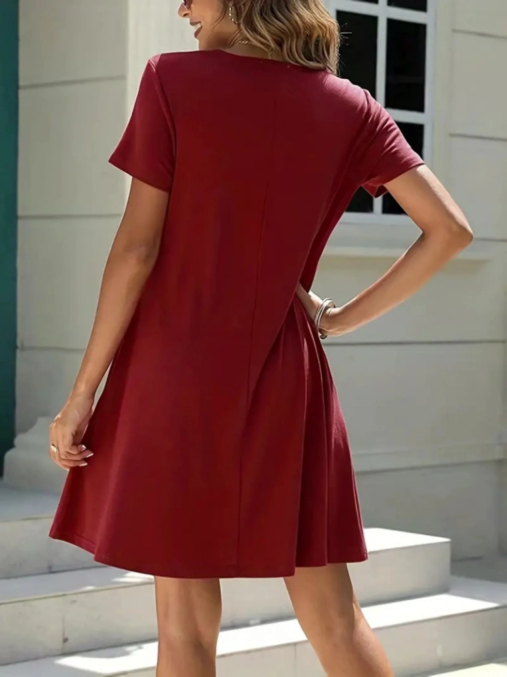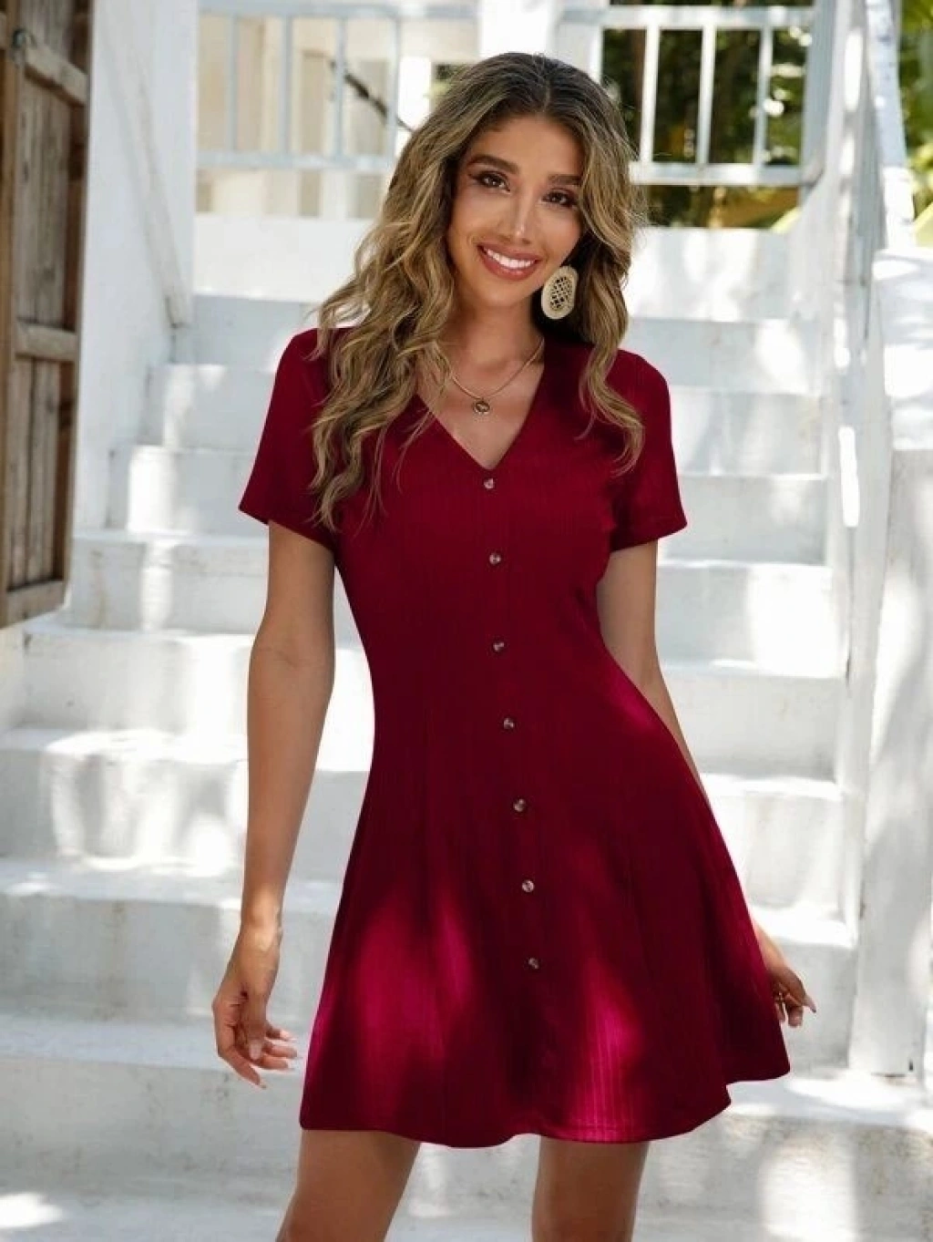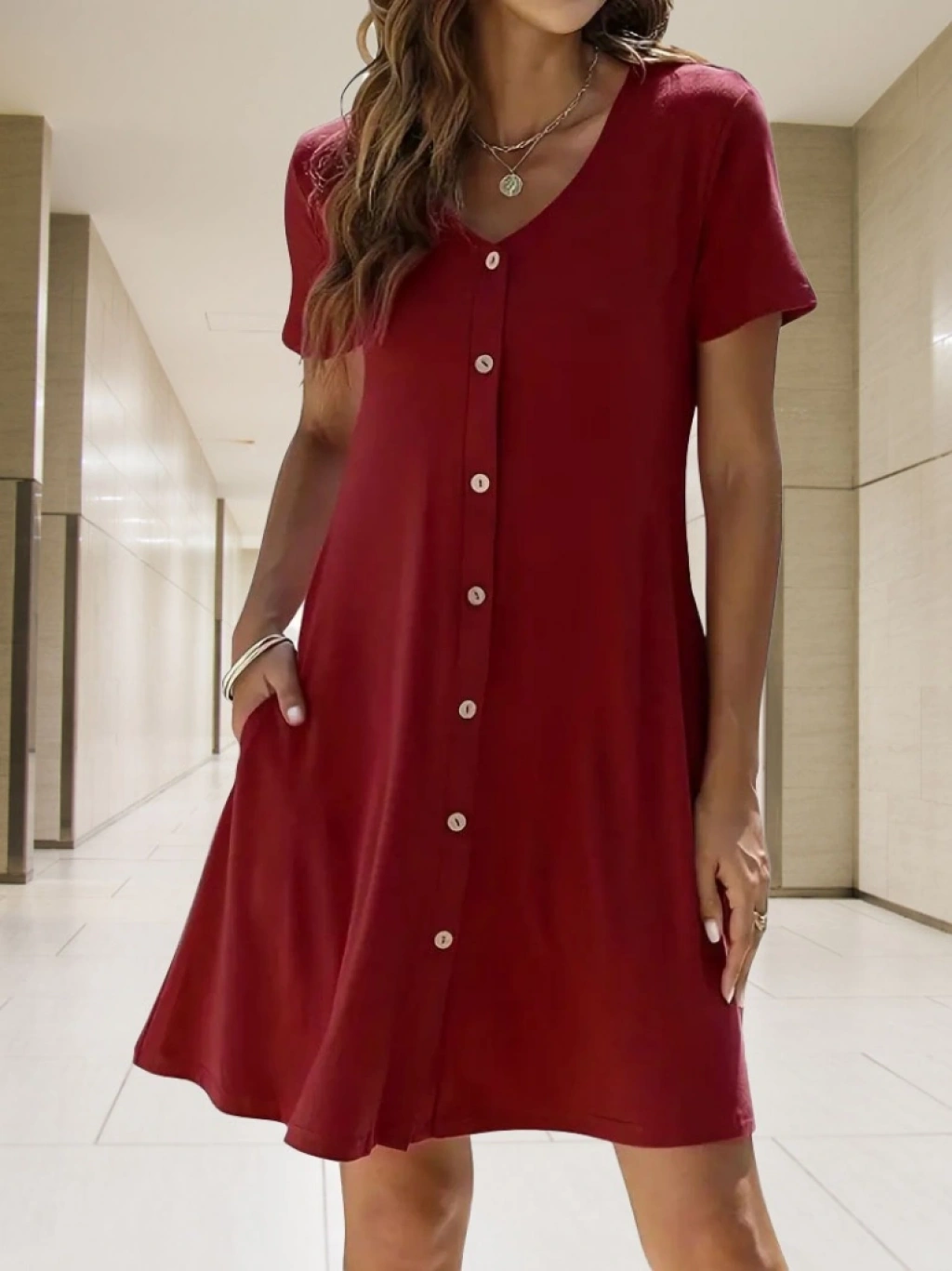 Kadın Kısa Kollu V Yaka önü Düğmeli Viskon Elbise