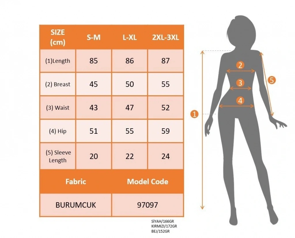 Modelin Ölçüleri: Boy:165, Kg:55, Göğüs:90, Bel:72, Kalça: 100