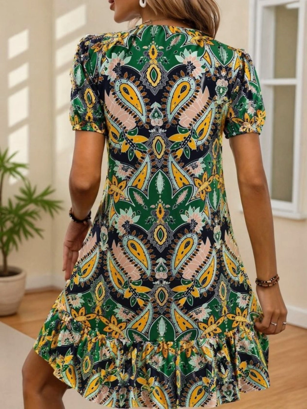 Kadın Kısa Kollu V Yakalı Desenli Kısa Süprem Elbise