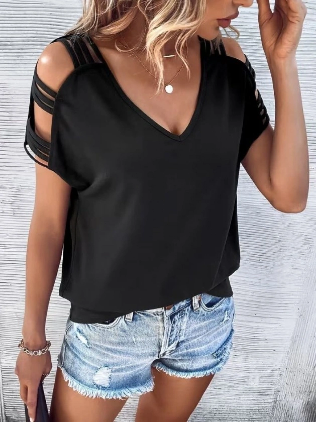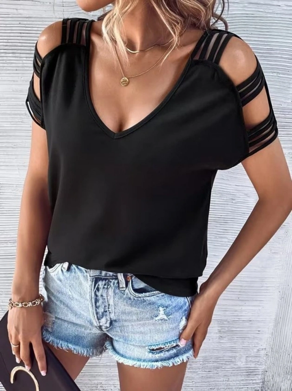 Kadın Kısa Kollu V Yakalı şerit Detaylı Viskon Bluz