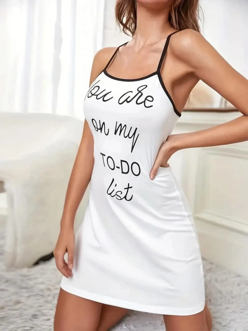 Kadın Kolsuz Askılı Sırt çapraz Detay To Do List Baskı Süprem Gecelik Elbise
