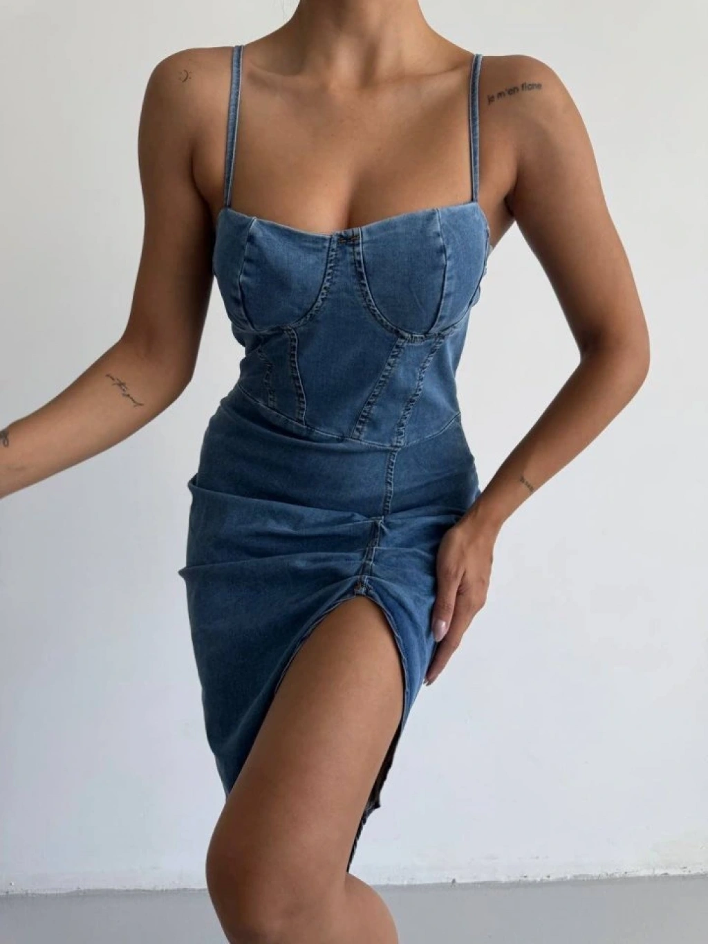 Kadın Omuz Askılı Derin Bacak Dekoltesi Ve Büzgü Detay Kot Elbise