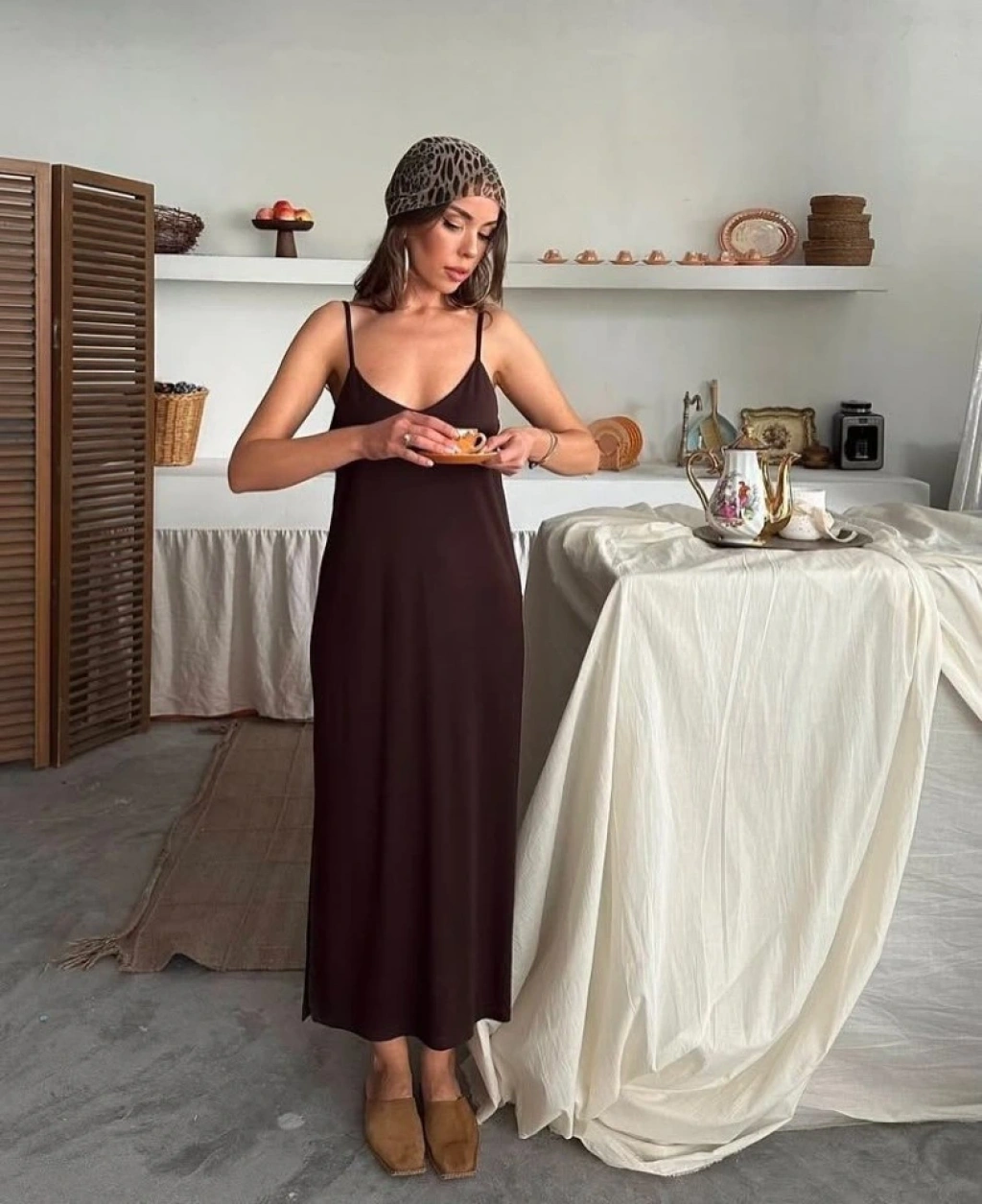 Kadın Siyah Asansör Askılı Çift Yırtmaçlı Helen Elbise
