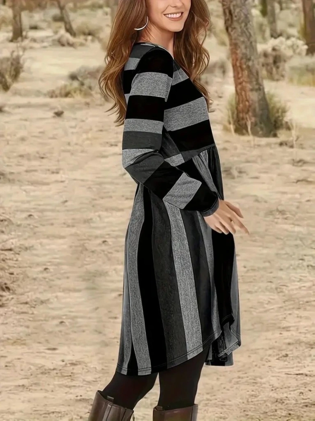Kadın Uzun Kollu Bisiklet Yaka çizgili Desen Detaylı Süprem Mini Elbise