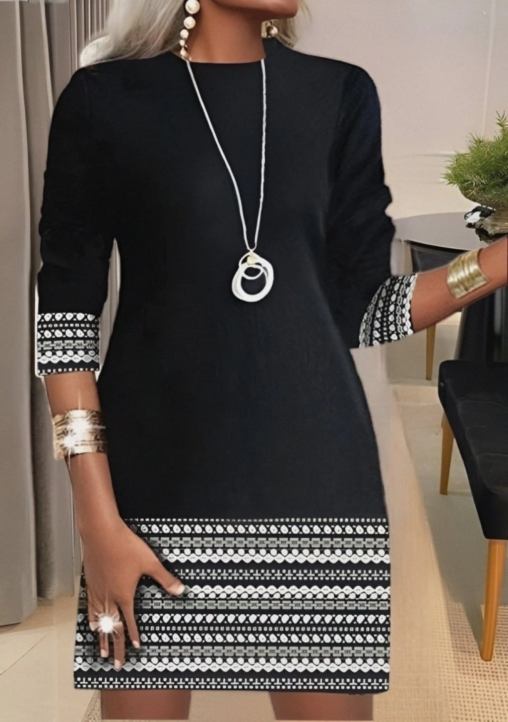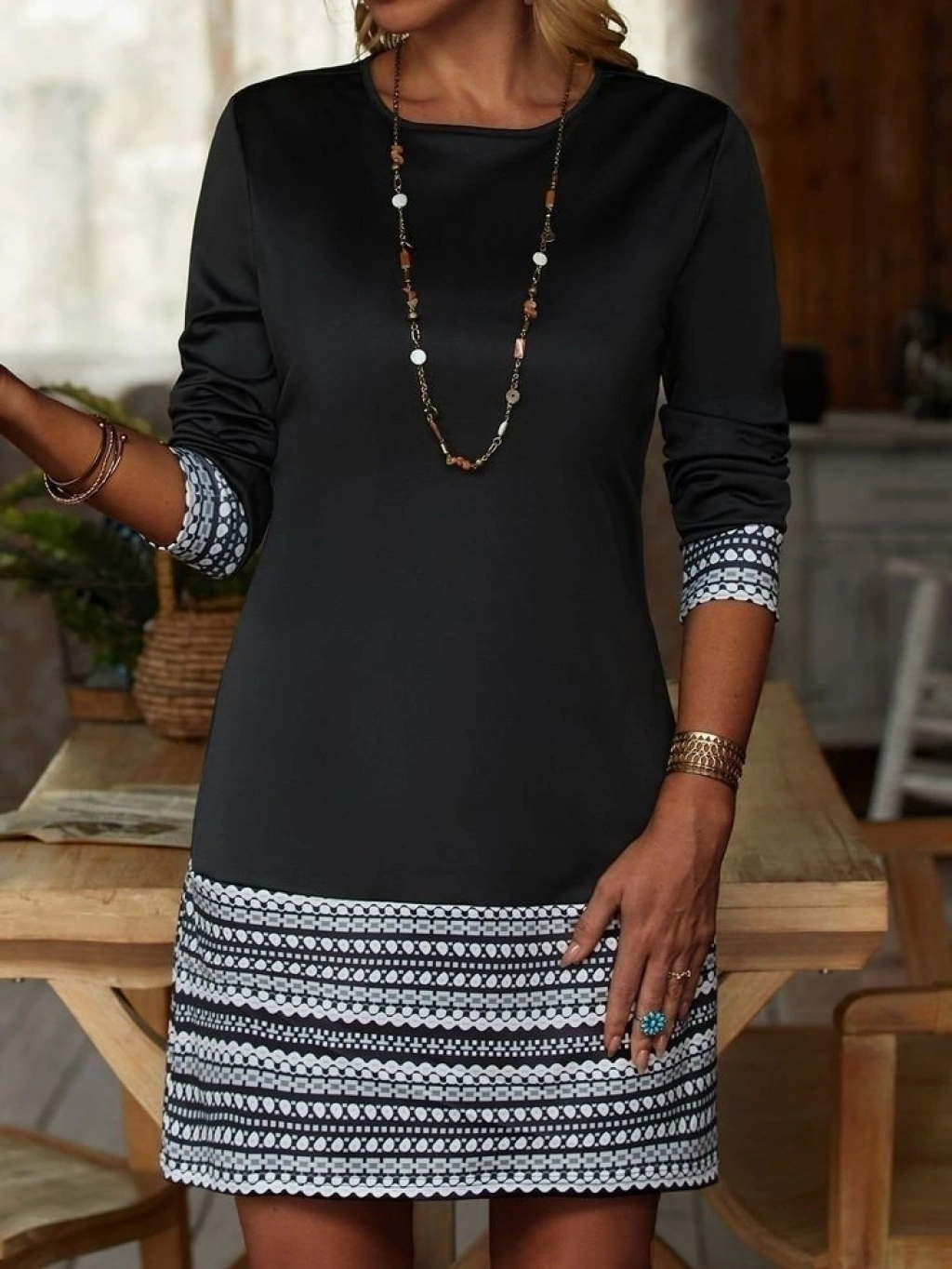 Kadın Uzun Kollu Bisiklet Yaka Kol Ağzı Ve Etek Ucu Baskılı Iki Iplik Elbise