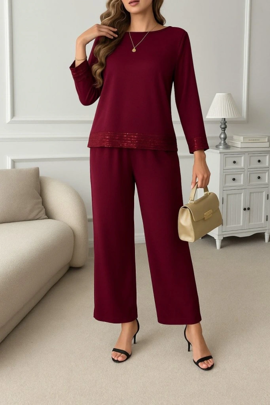 Kadın Uzun Kollu Bisiklet Yaka Pulpayetli Viskon Iki Iplik Bluz Ve Pantolon Ikili Takım