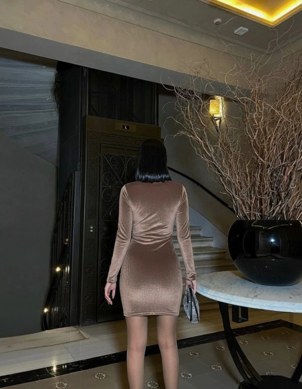 Kadın Uzun Kollu Göğüs Dekolteli Kadife Kumaş Mini Kruvaze Elbise
