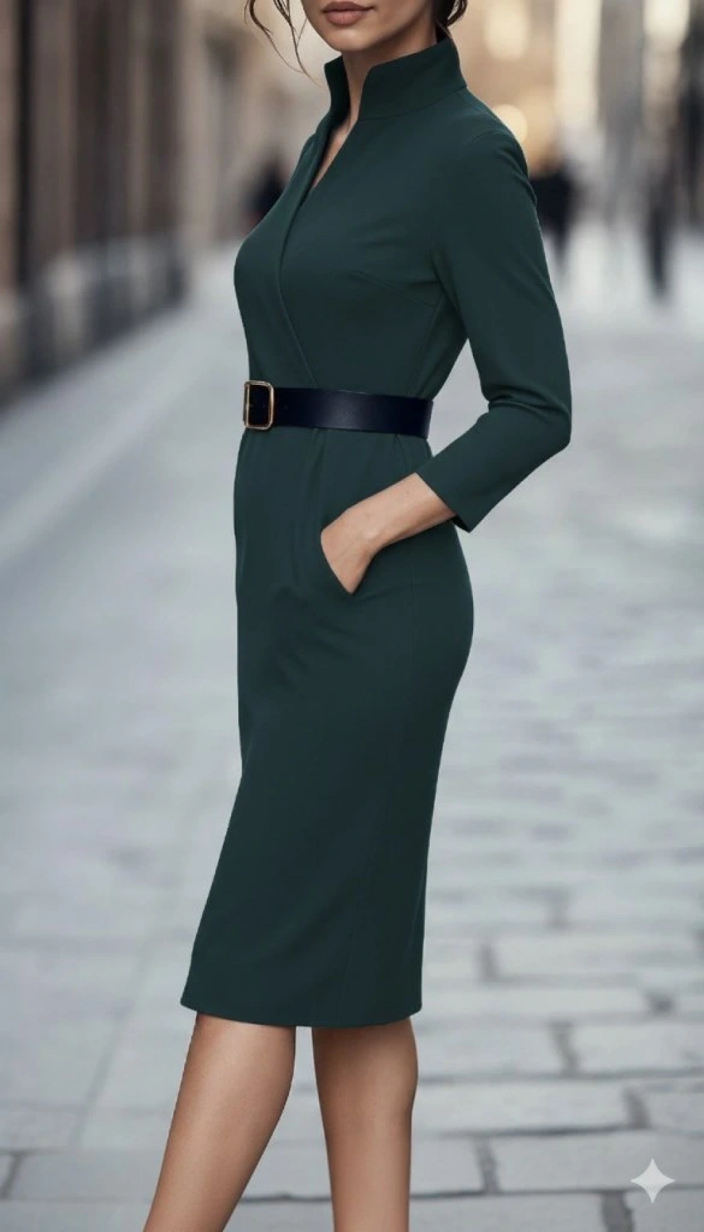 Kadın Uzun Kollu Hakim Yaka Beli Kemerli Cepli Midi Ithal Krep Elbise