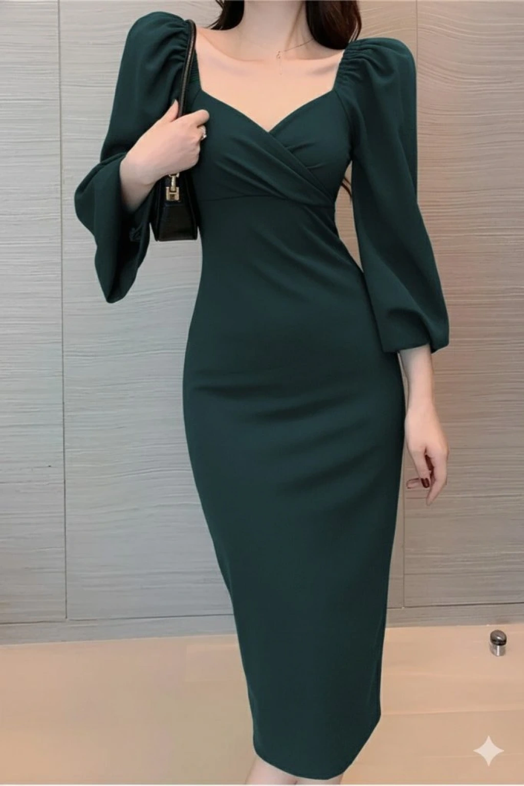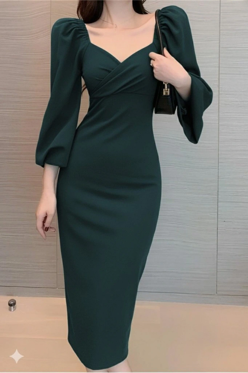 Kadın Uzun Kollu Kalp Yakalı Midi Ithal Krep Elbise