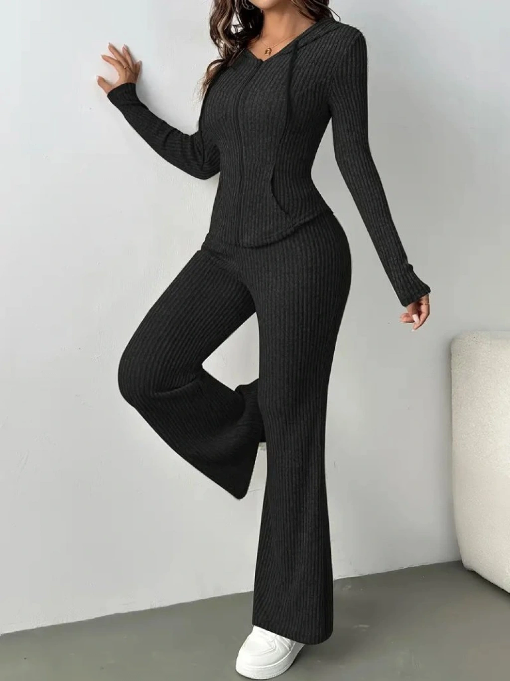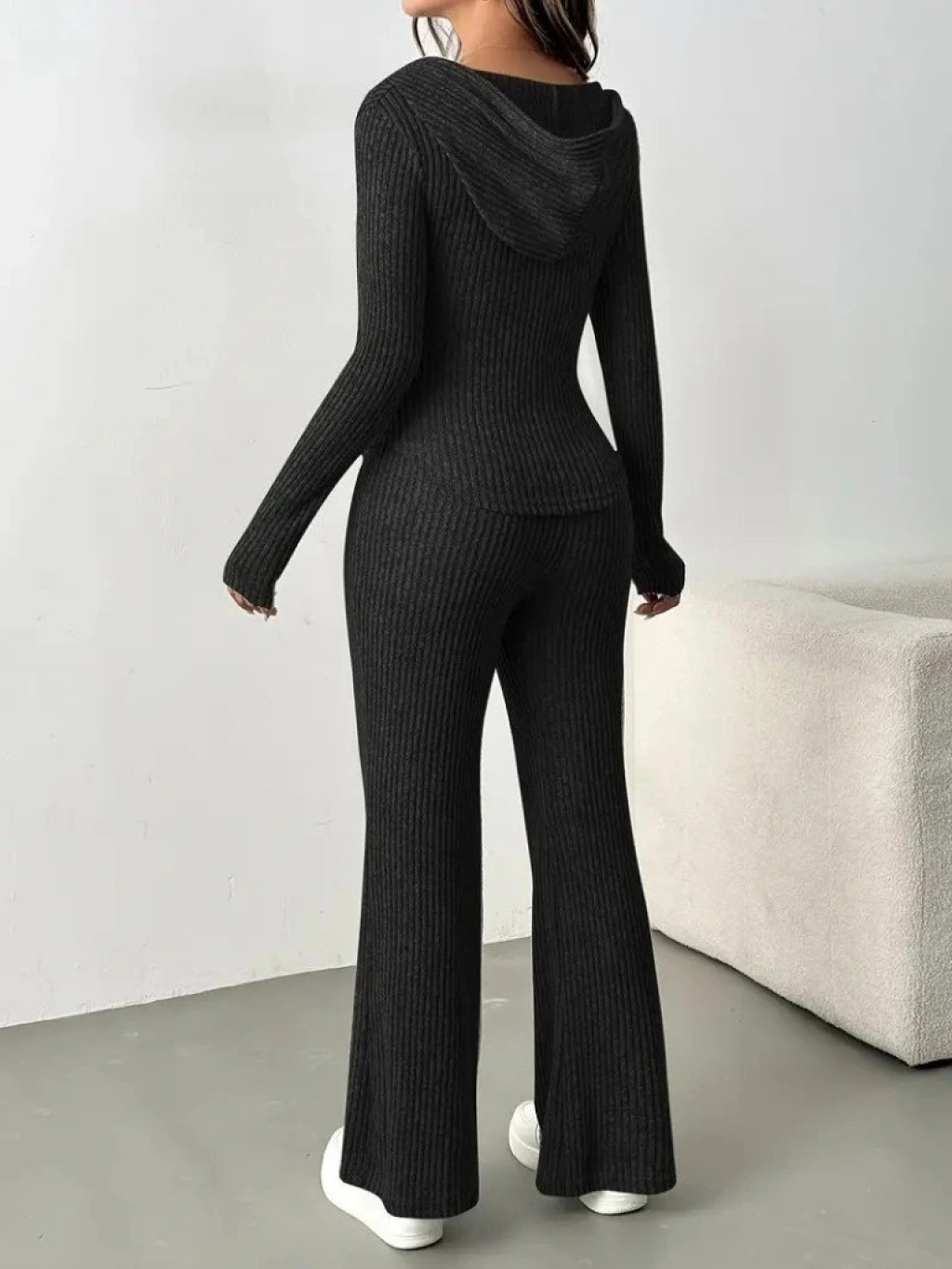Kadın Uzun Kollu Kapşonlu önden Fermuarlı Kaşkorse Bluz Ve Pantolon Ikili Takım