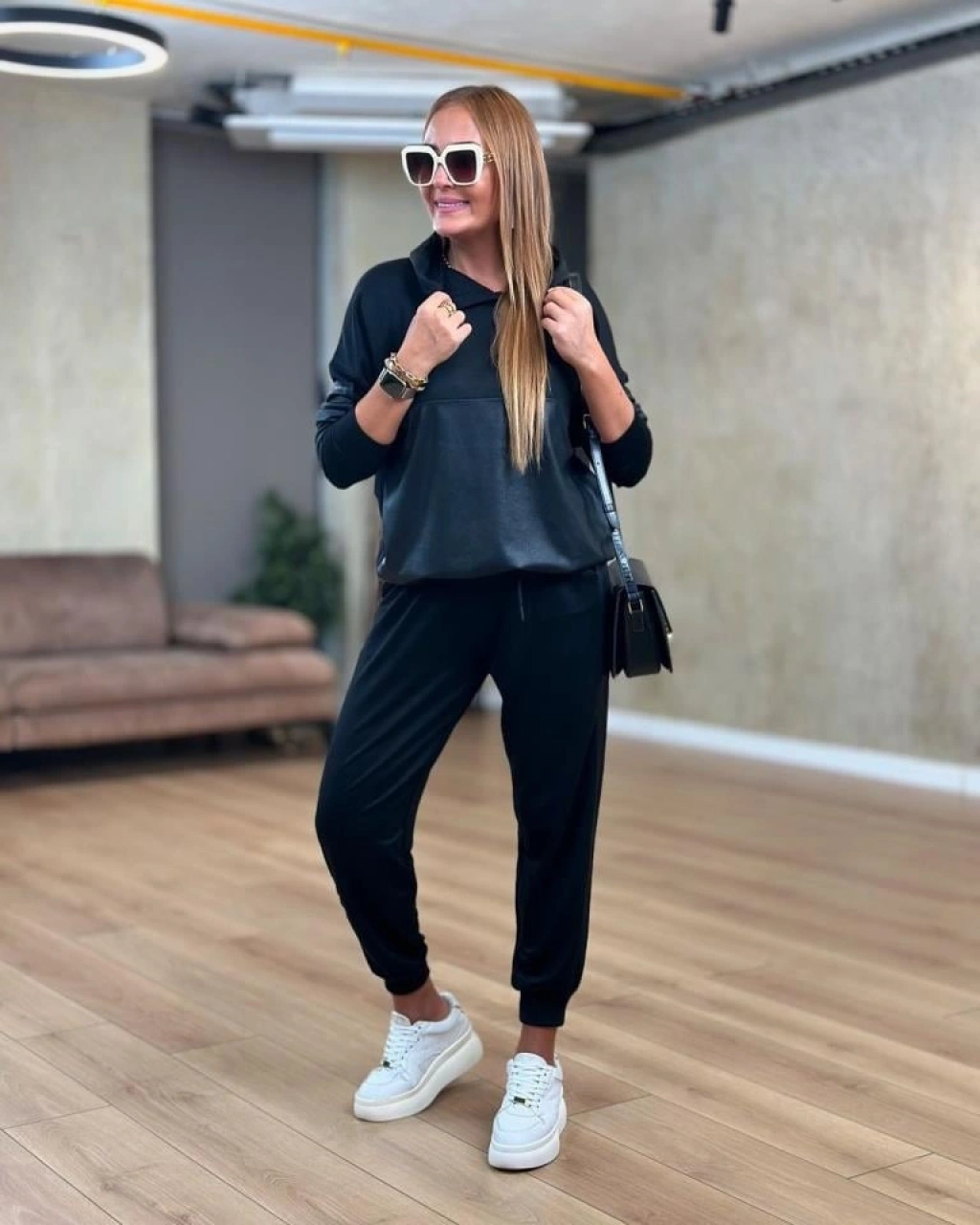 Kadın Uzun Kollu Kapşonlu Viskon Iki Iplik Bluz Ve Pantolon Ikili Takım