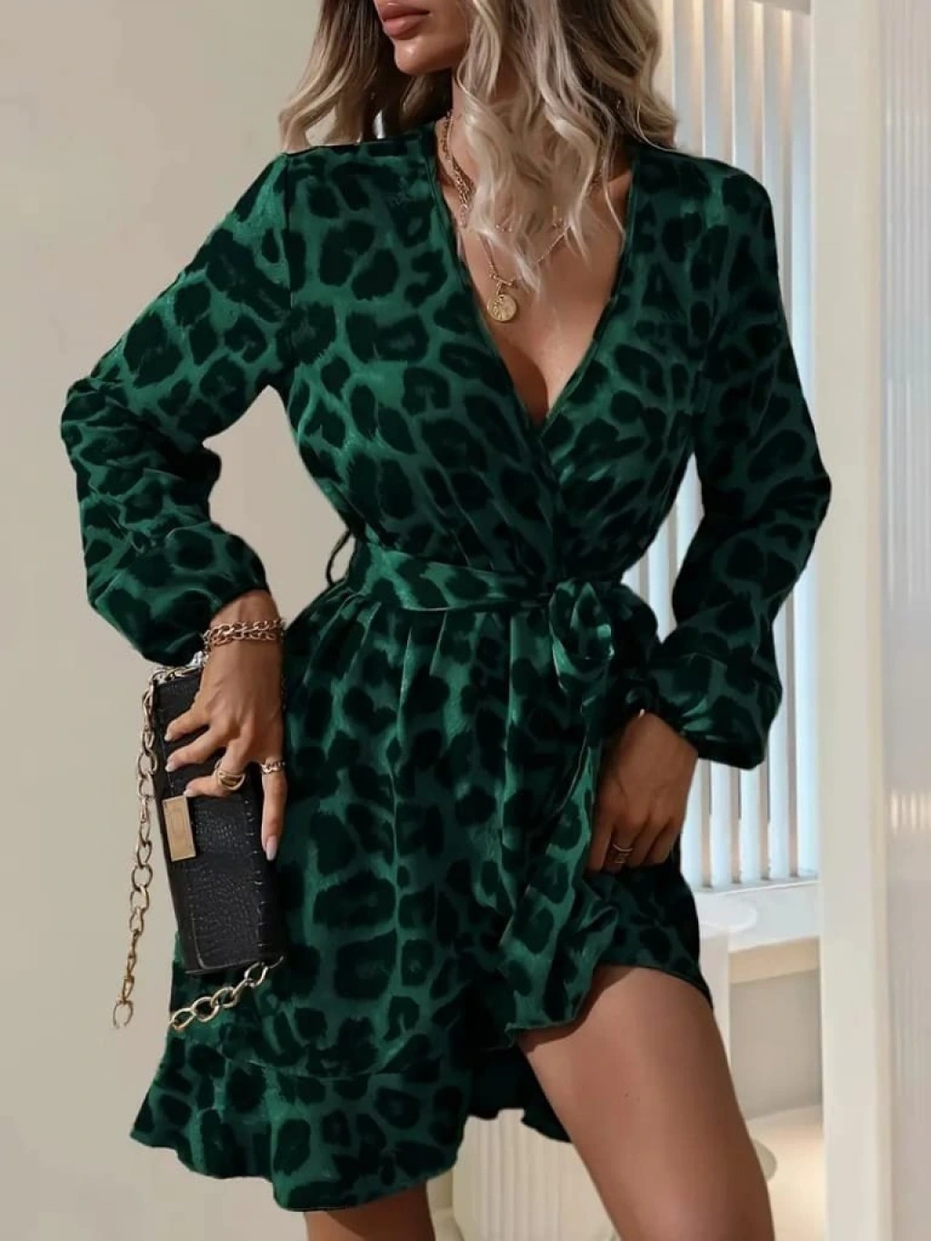 Kadın Uzun Kollu Kruvaze Yaka Beden Kuşaklı çapraz Kesim Detaylı Leopar Modal Mini Elbise