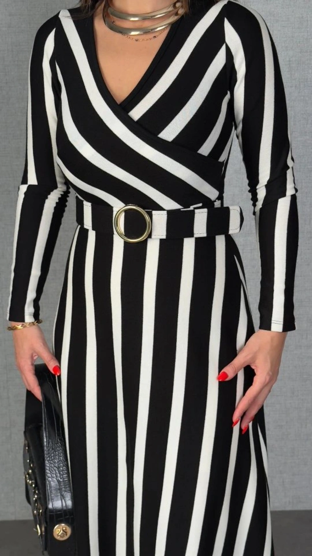 Kadın Uzun Kollu Kruvaze Yaka Kemer Dahil çizgili Triko Elbise