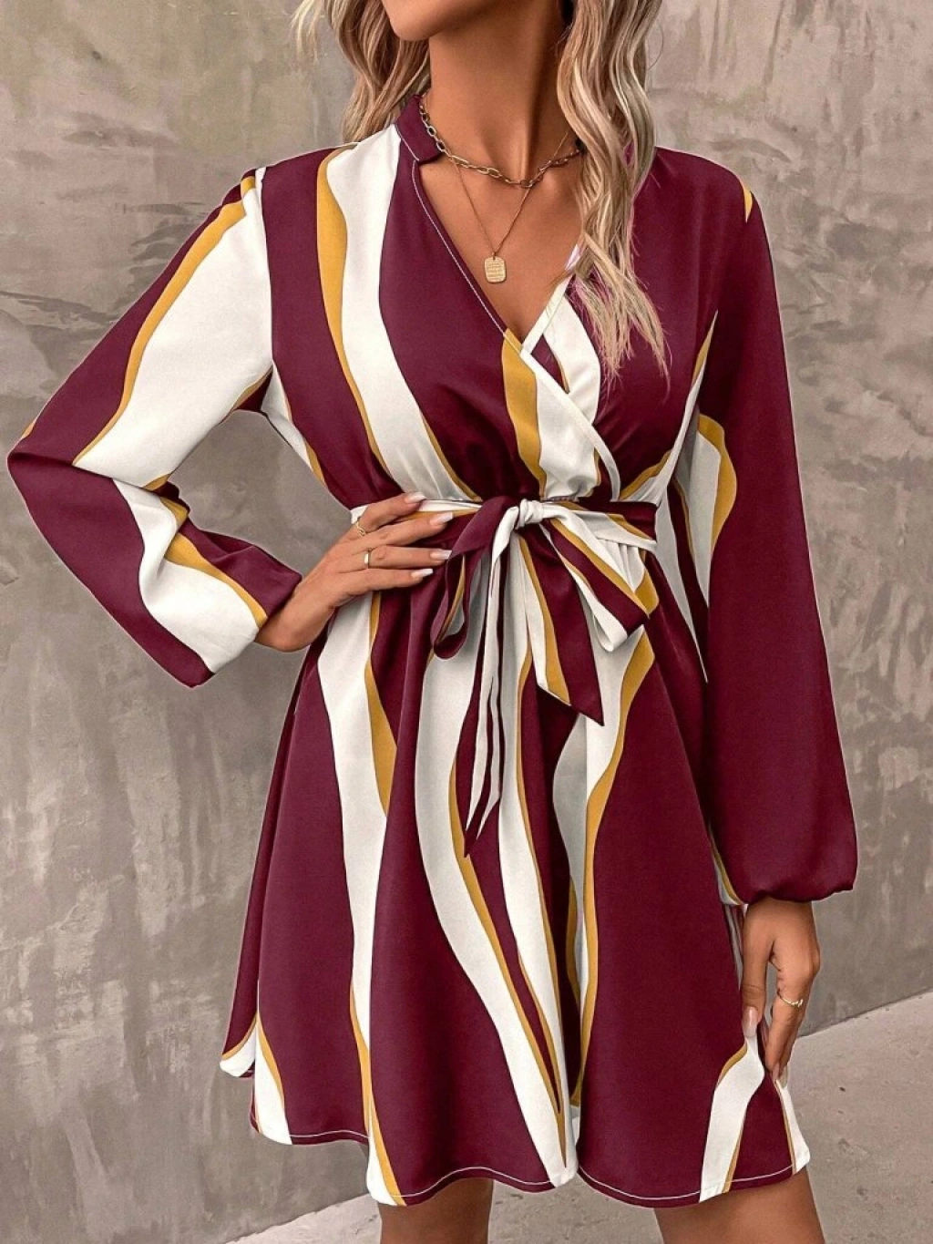 Kadın Uzun Kollu Kruvaze Yakalı Desenli Modal Mini Elbise