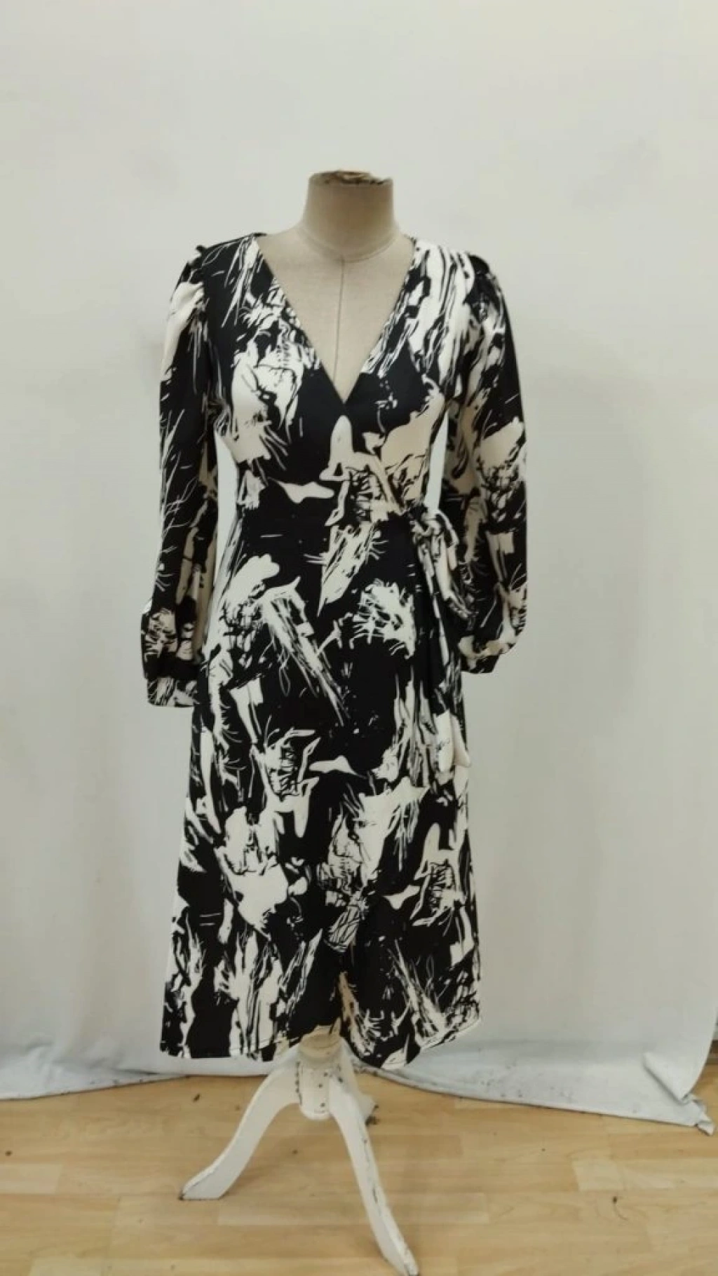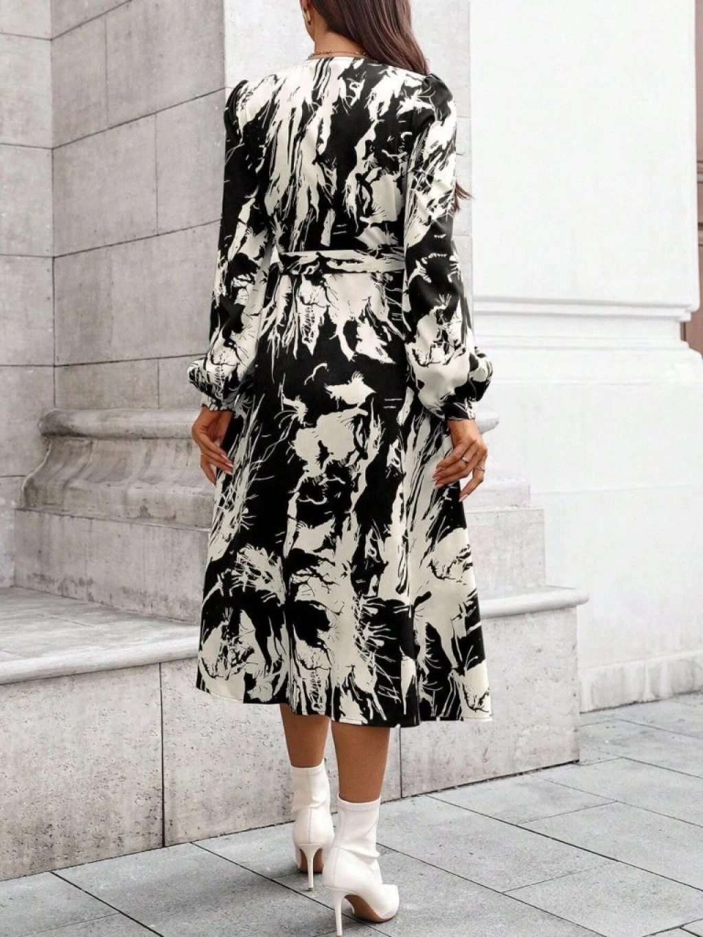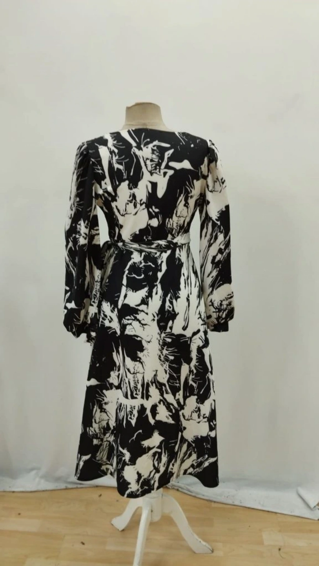 Kadın Uzun Kollu Kruvaze Yakalı Yandan Bağlamalı Desenli Mini Modal Elbise