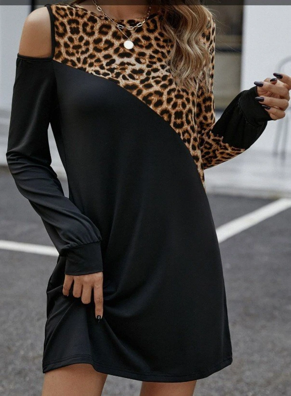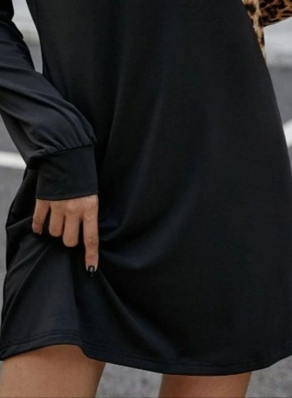 Kadın Uzun Kollu Omuzdan Açık Leopar Desenli Viskon Iki Iplik Mini Elbise