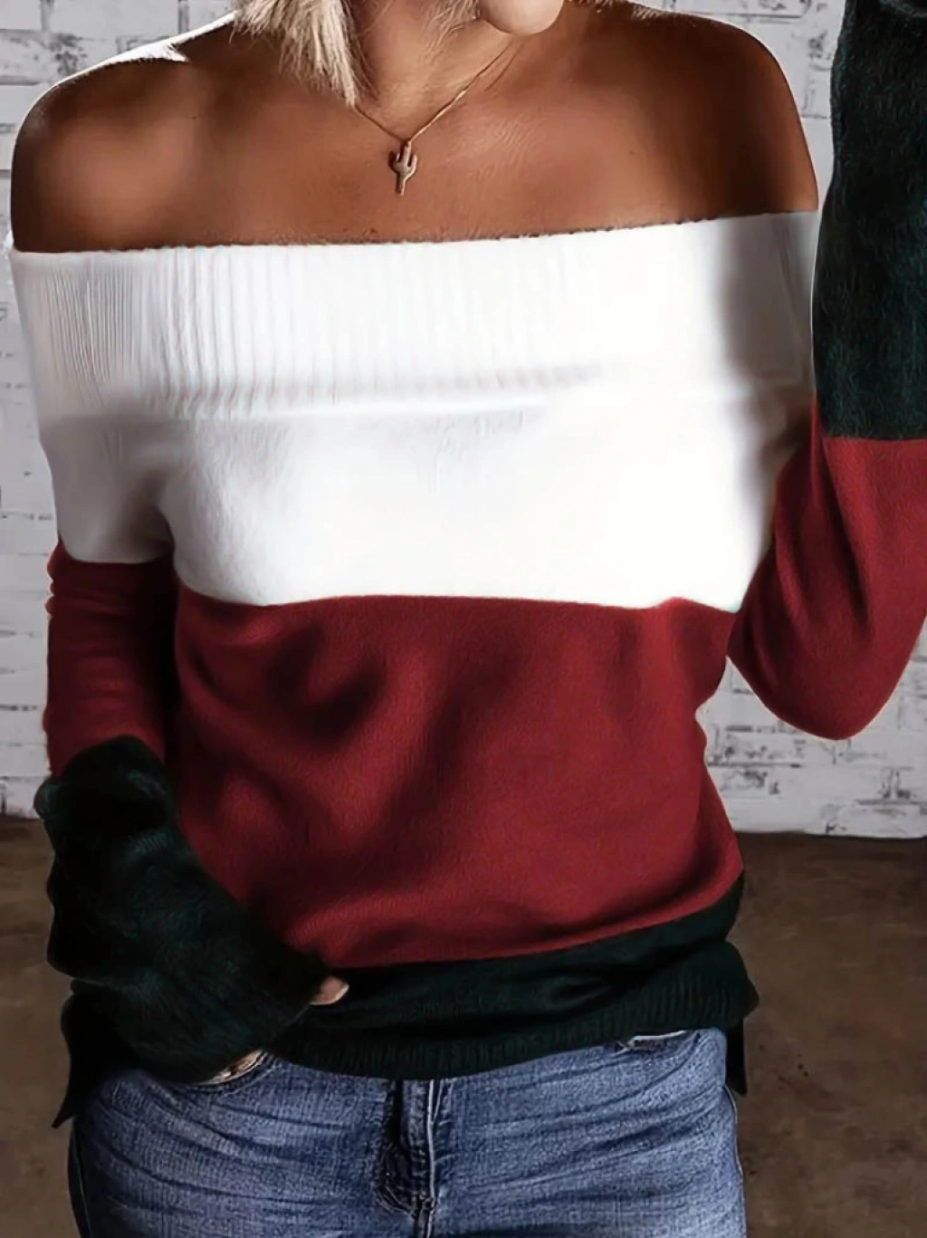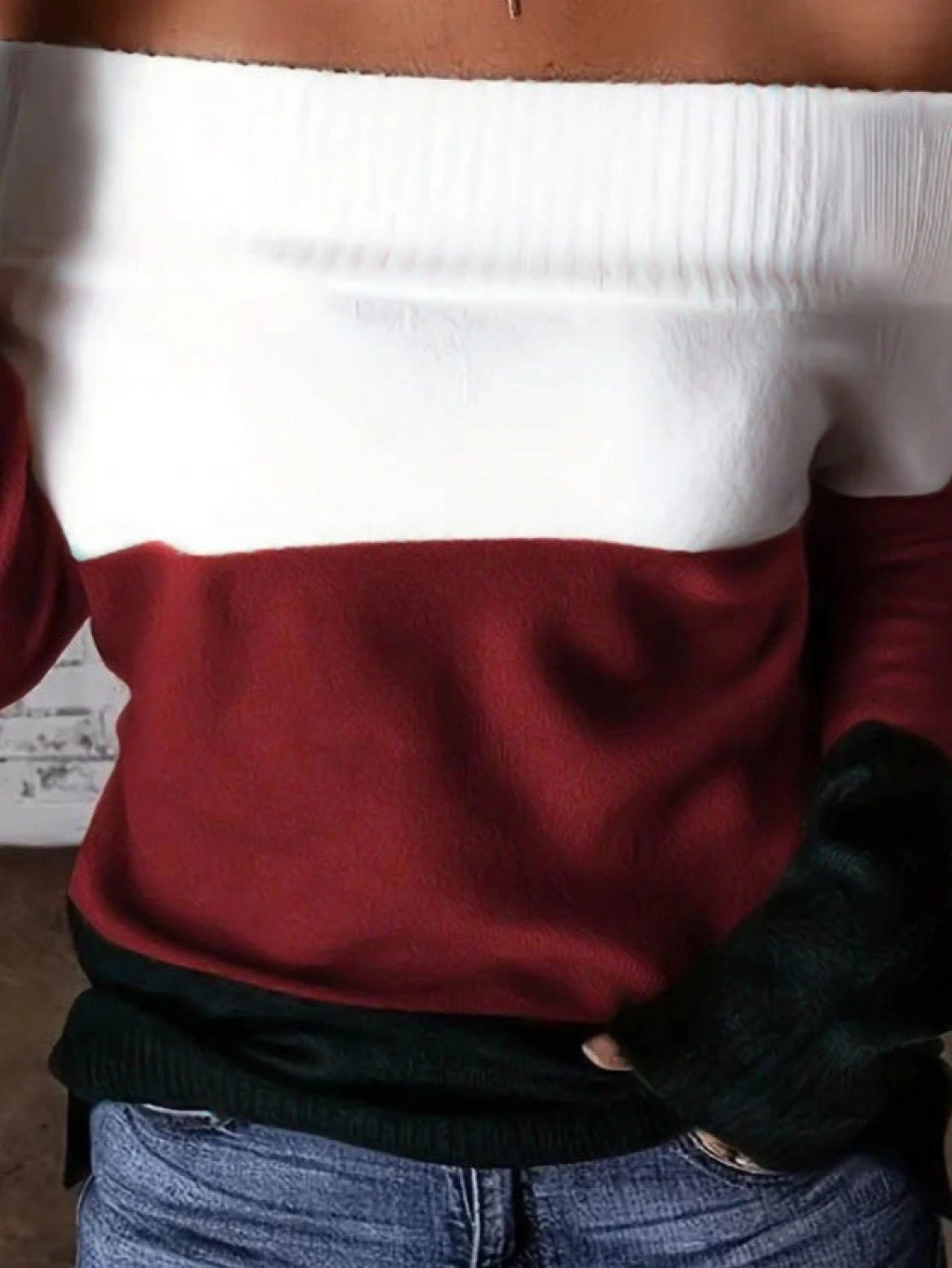 Kadın Uzun Kollu Omuzlardan Açık Uzun Kollu Blok çizgili Triko Bluz