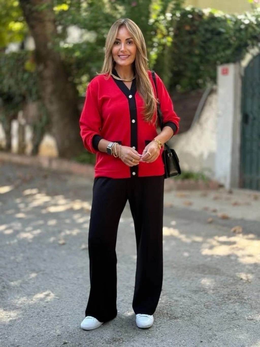 Kadın Uzun Kollu Ribanali Cep Detay Hırka Ve Bol Paça Pantolon Ikili Takım