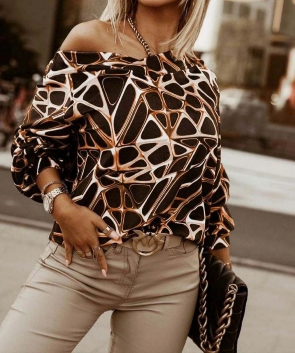 Kadın Uzun Kollu V Yaka Düşük Omuz Geometrik Desen şardonlu Dalgıç Bluz
