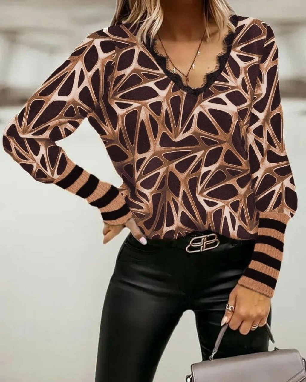 Kadın Uzun Kollu V Yaka Kenarları Güpür Detay şardonlu Dalgıç Bluz