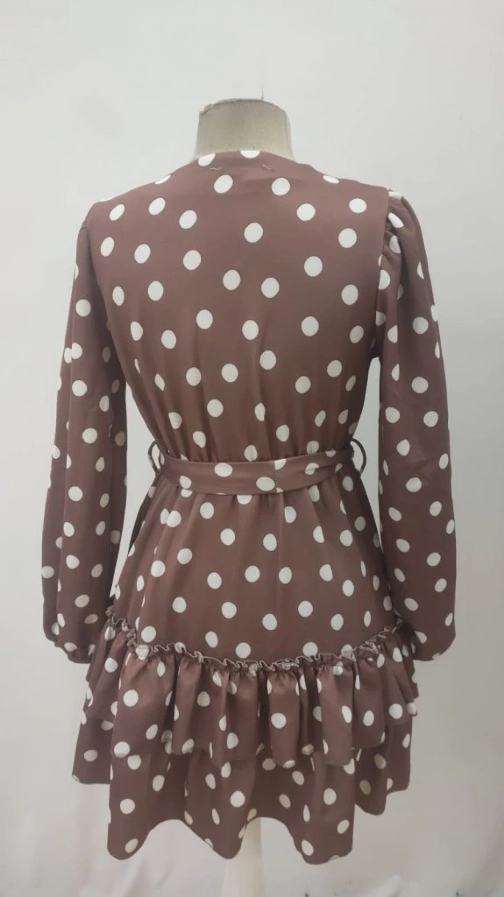 Kadın Uzun Kollu V Yakalı Belden Kuşaklı Puantiyeli Mini Modal Elbise